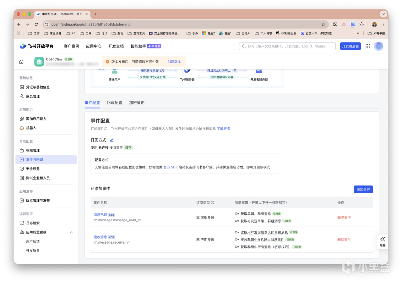 最后在事件订阅中,选择「使用长连接接收事件」,添加事件:im.message.receive_v1,如下图所示。