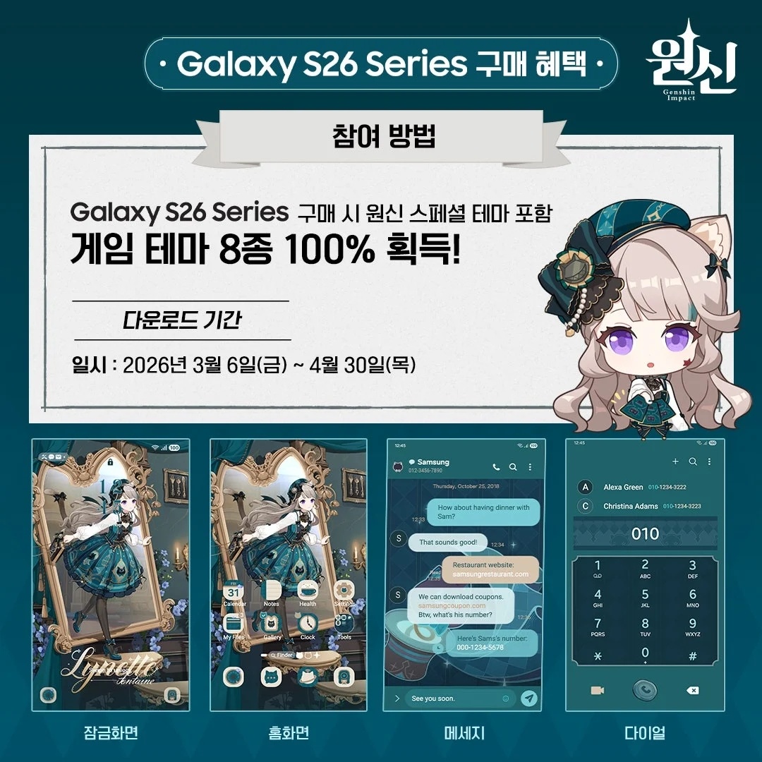 购买Galaxy S26系列机型,可100%获取《原神》专属主题。