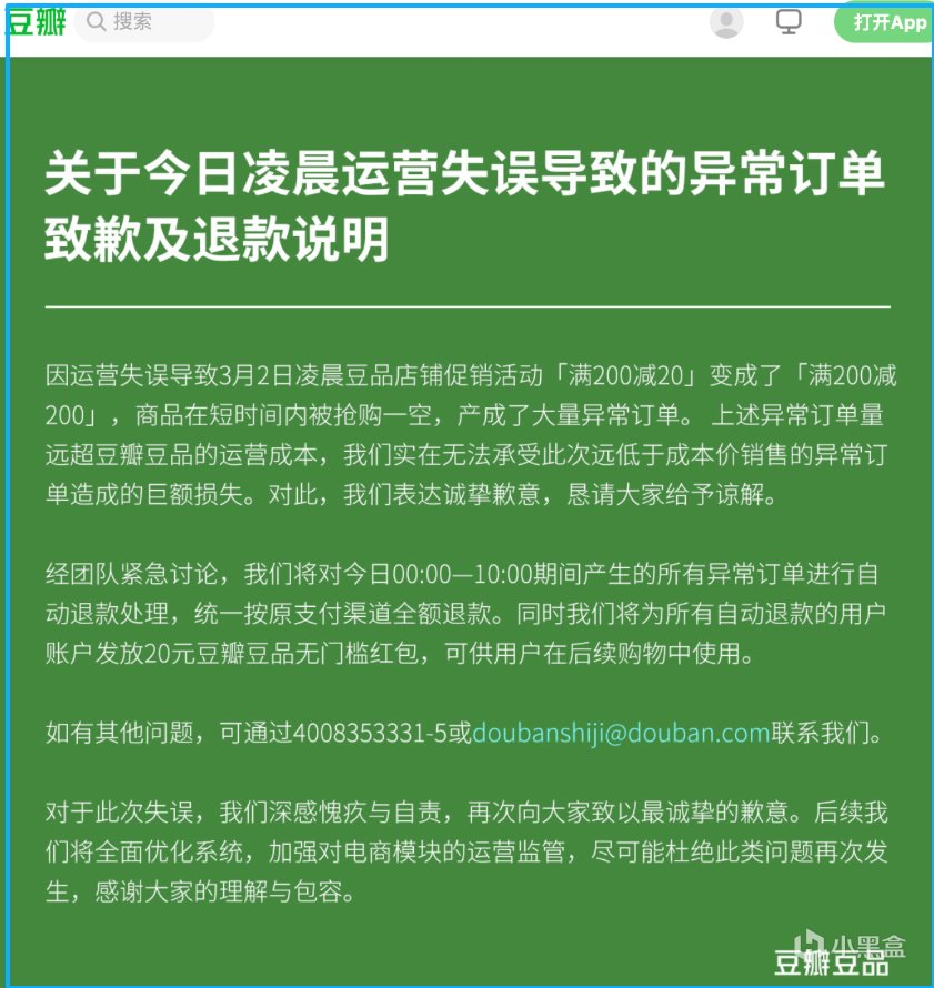 这次问题出在豆瓣豆品的妇女节活动设置上,原本是满 200 减 20 的常规优惠,后台操作时直接改成了满 200 减 200。