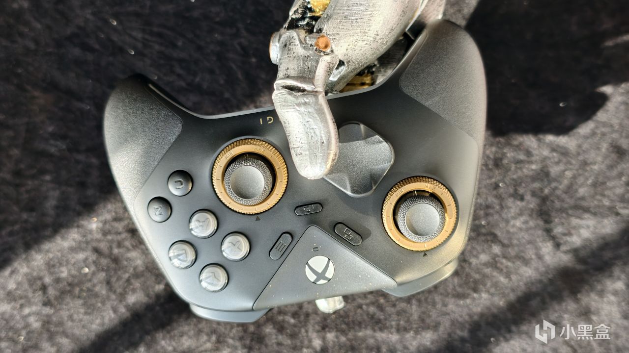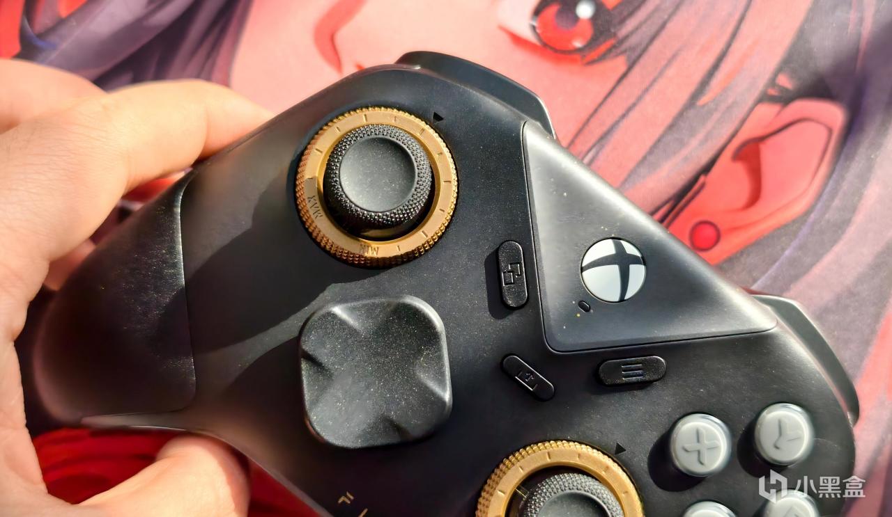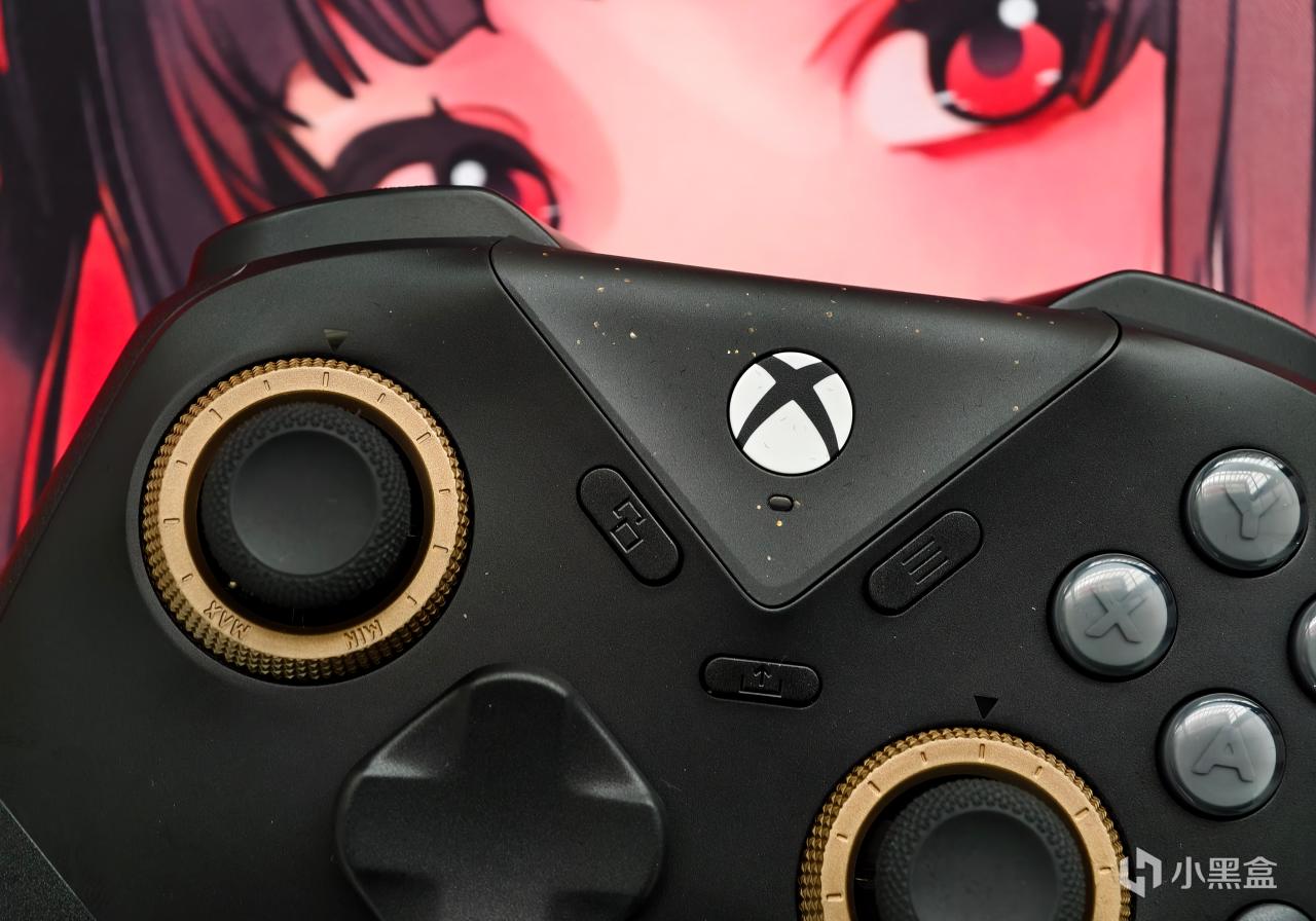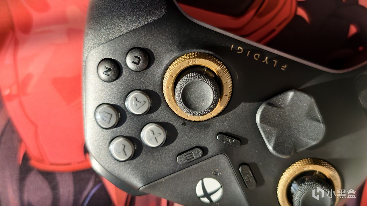 外观上和黑武士5Pro的区别主要是把飞智的实体LOGO键换成了Xbox的西瓜标,同时也保留了三角盖板上做点缀的金粉,配合暗金色的阻尼调节环,整体展现出一种轻奢感。