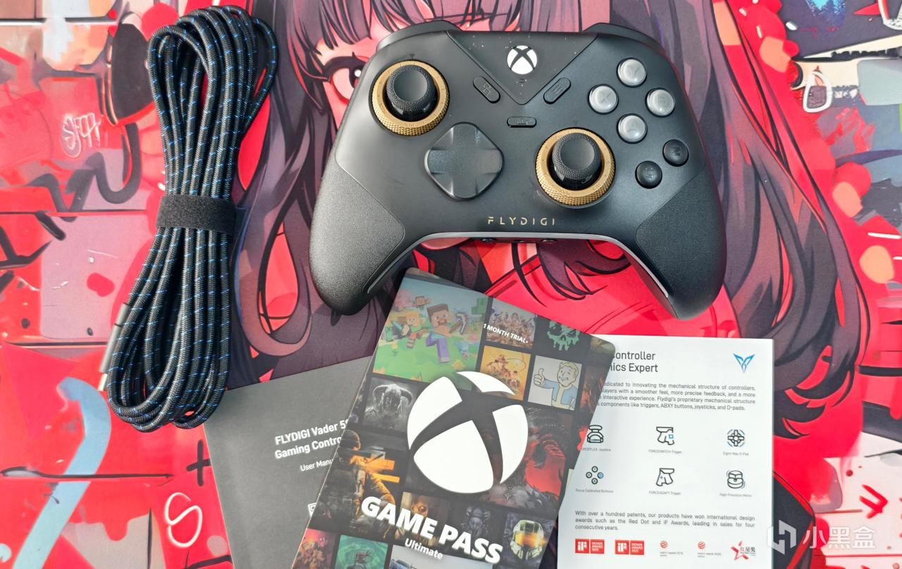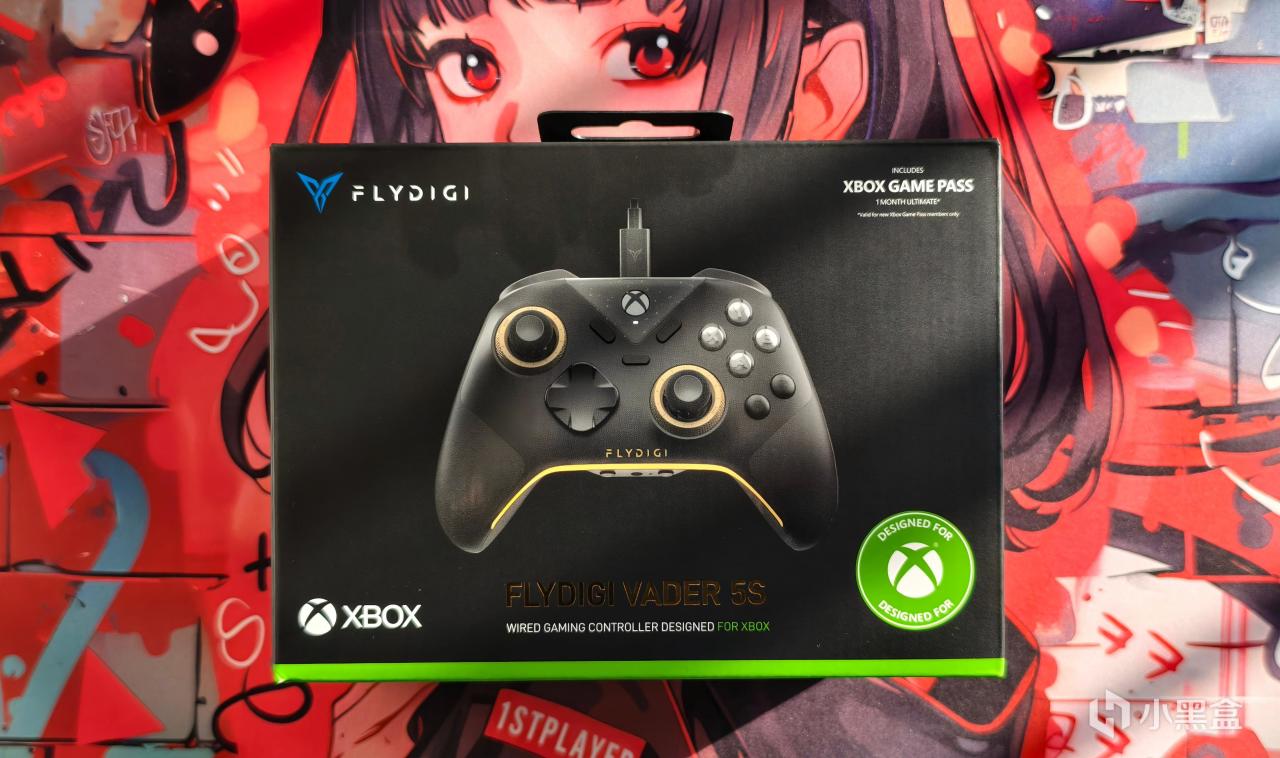 飞智最近几代产品的包装都非常有辨识性,但黑武士5S作为微软授权手柄,它的包装风格自然也要受到微软方面的指导:左上角是飞智自己的LOGO,右上角写着内含XGPU月卡,下方则是微软授权手柄统一的绿条和标识,当然从手柄渲染图上就能看出是这是有线授权手柄。