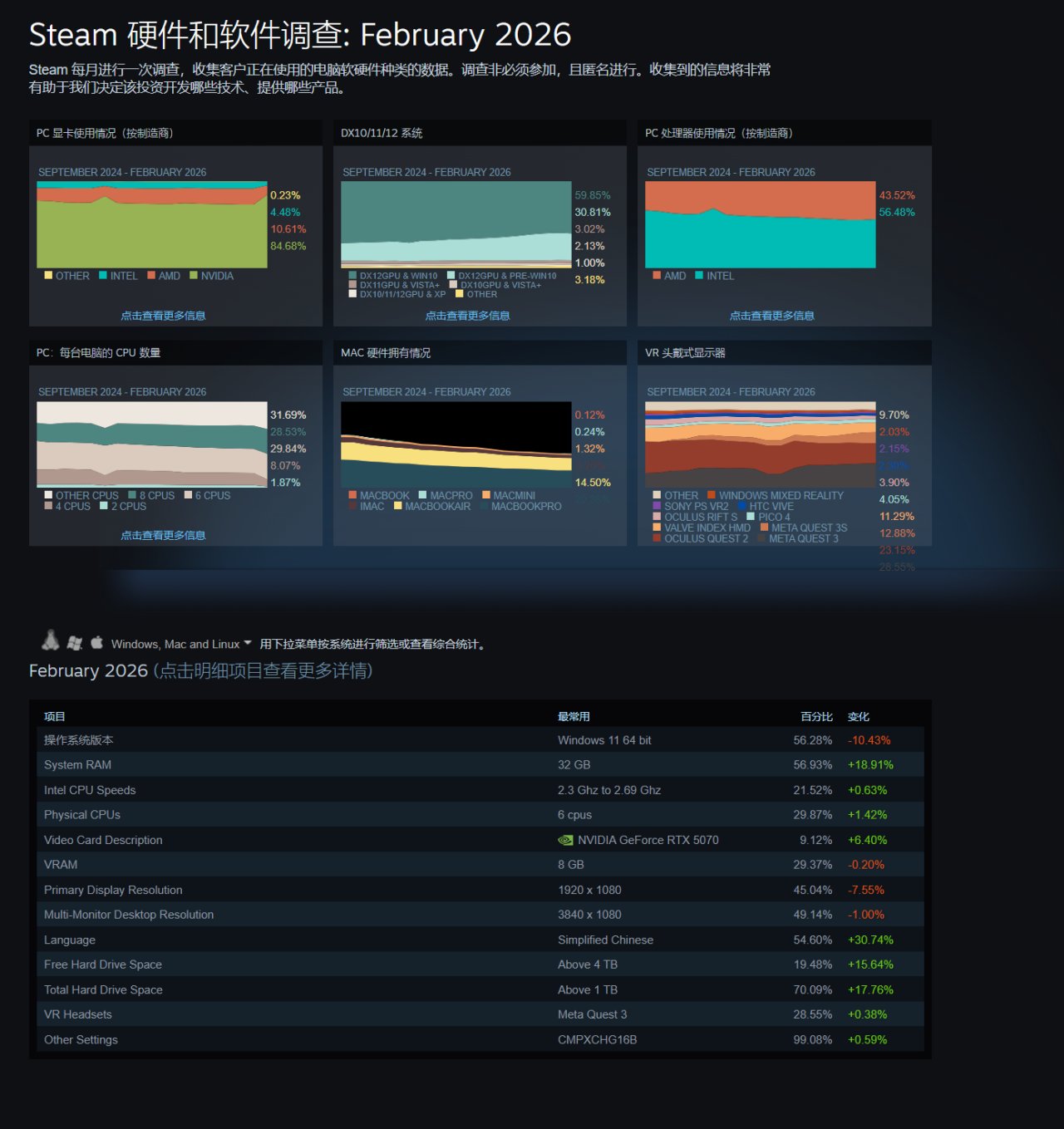 Steam 2月硬件调查报告现已公布,下面是各项目中最常用的数据统计整理: