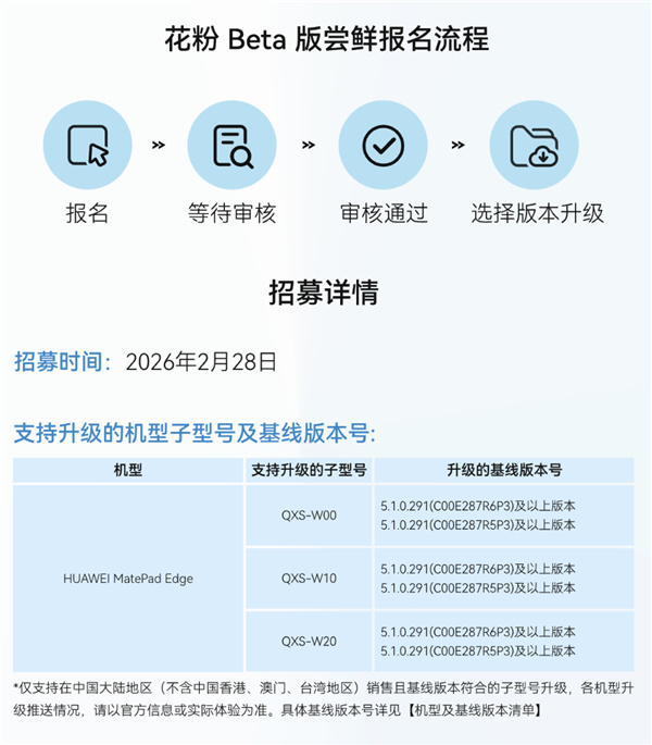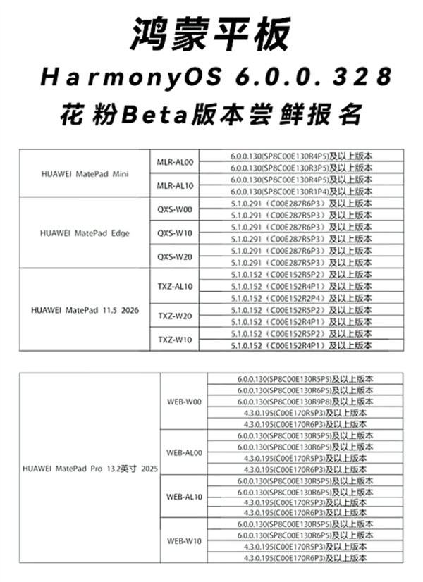 另外值得一提的是,此次HarmonyOS 6花粉Beta版尝鲜升级审核通过后,同一账号下满足升级尝鲜活动要求的设备,如华为MatePad Mini 系列、华为MatePad 11.5 2026以及华为MatePad Pro 13.2 英寸 2025等均可尝鲜HarmonyOS测试版本。