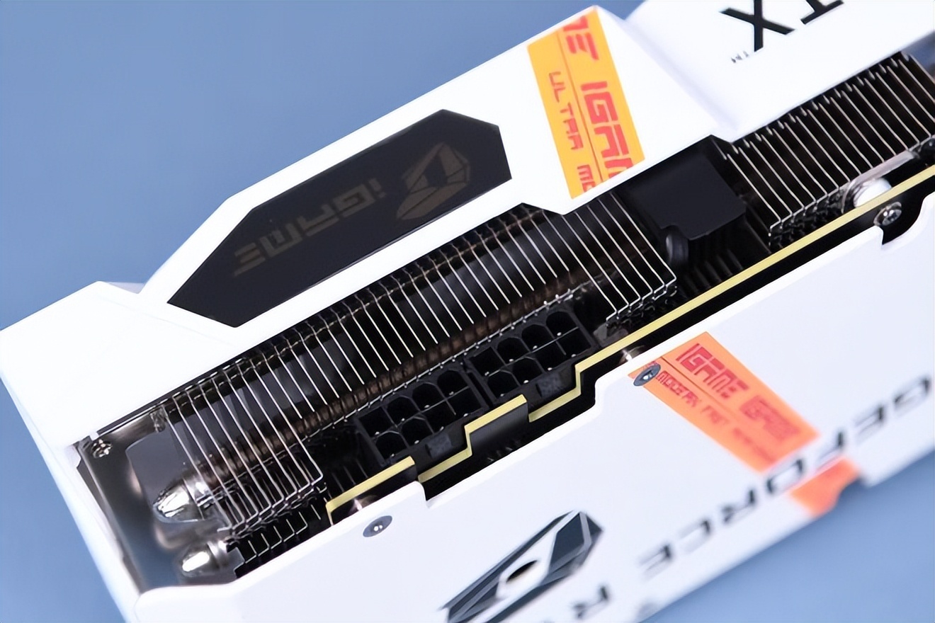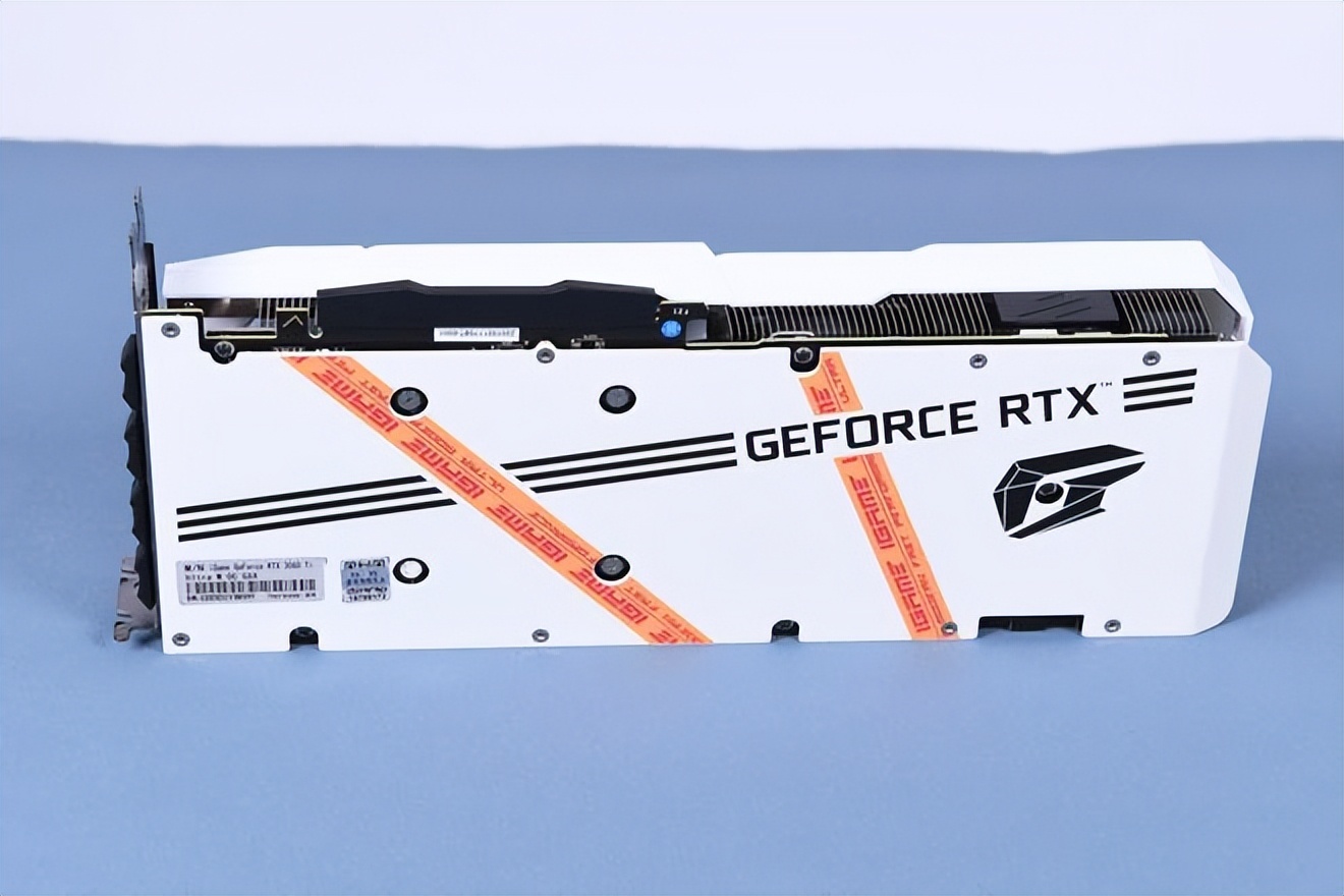 七彩虹iGame GeForce RTX 3060 Ti Ultra W OC G6X显卡使用近乎纯白的外观来迎合追求浅色系装机玩家。当然,纯白色的外观会显得过于低调。七彩虹为显卡设计了渐变色与橙色仿胶带条纹作为装饰,“蒸汽波”设计语言让整卡的视觉效果极具冲击力。