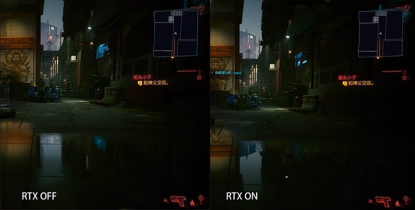 《赛博朋克2077》是为GeForce RTX系列显卡专属优化的游戏,融入大量全新特性,例如:光线追踪、DLSS等。在明暗分明的场景下,未开启光线追踪时,阴影边缘生硬,运动中的物体缺少光影交互,整体极为不自然。而开启光线追踪后,阴影自然柔,颜色呈现接近于真实。
