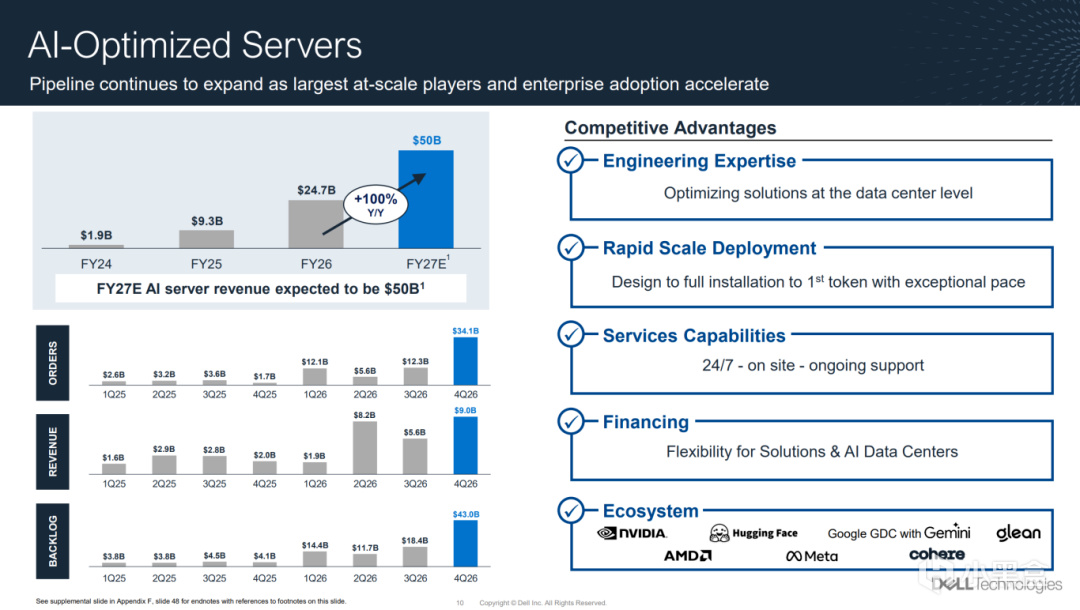 戴爾科技集團副董事長兼首席運營官Jeff Clarke表示,2026財年是公司歷史上具有里程碑意義的一年,營收、每股收益和現金流均實現歷史突破。他強調,人工智能帶來的機遇正在重塑公司發展,2026財年公司獲得超過640億美元的AI優化服務器訂單,全年出貨量超250億美元,截至財年末,仍有430億美元的創紀錄積壓訂單,充分證明公司的工程技術實力和差異化AI解決方案獲得市場高度認可,目前公司AI服務器客戶已超4000家,包括馬斯克旗下xAI等知名企業。
