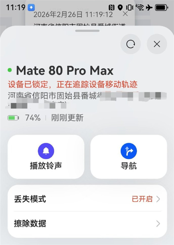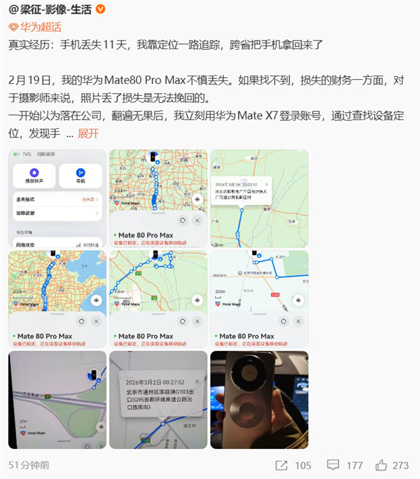 快科技3月2日消息,一位博主今日发帖称,“自己的华为Mate80 Pro Max丢失11天,自己靠着定位一路追踪,跨省把手机拿回来了”。