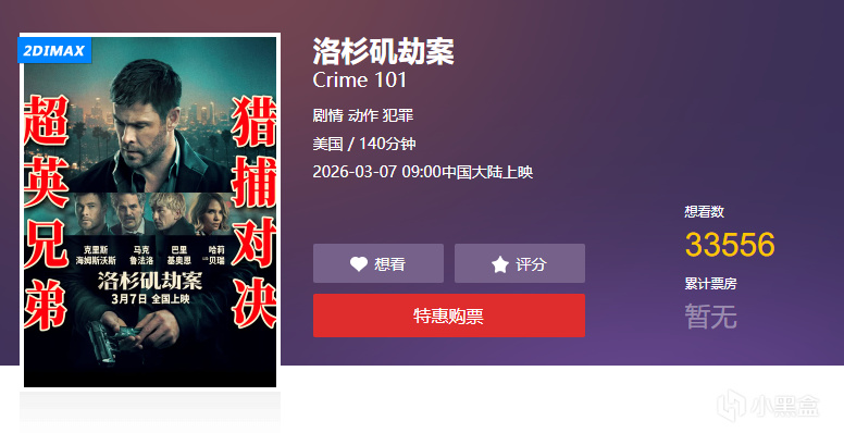 核心类型为动作 / 犯罪 / 剧情,定于 2026 年 3 月 7 日上映,已开启预售,由克里斯・海姆斯沃斯、马克・鲁法洛领衔主演。影片聚焦洛杉矶一场高智商跨国劫案,“锤哥” 饰演的特种部队退役人员被迫卷入犯罪漩涡,与马克・鲁法洛饰演的警方谈判专家展开猫鼠博弈,一边是精心布局的劫案阴谋,一边是人性的挣扎与救赎,“锤哥” 领衔的硬核动作片,聚焦高智商城市劫案,剧情紧凑、动作场面炸裂。