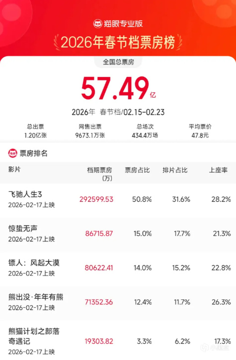 为期 9 天的 2026 年春节档正式收官,这场影史周期最长的新春银幕盛宴,交出了总票房 57.52 亿元、观影人次 1.20 亿的成绩单,尽管票房较去年有所回调,但435 万场的放映总场次刷新了中国影史春节档纪录。