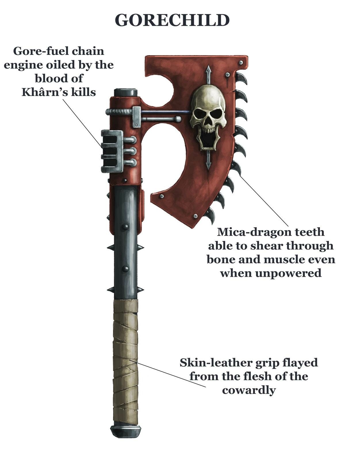 它是卡恩近战之外的重要补充,能在冲锋前摧毁敌人的重型装甲,为其链锯斧的攻击创造机会。