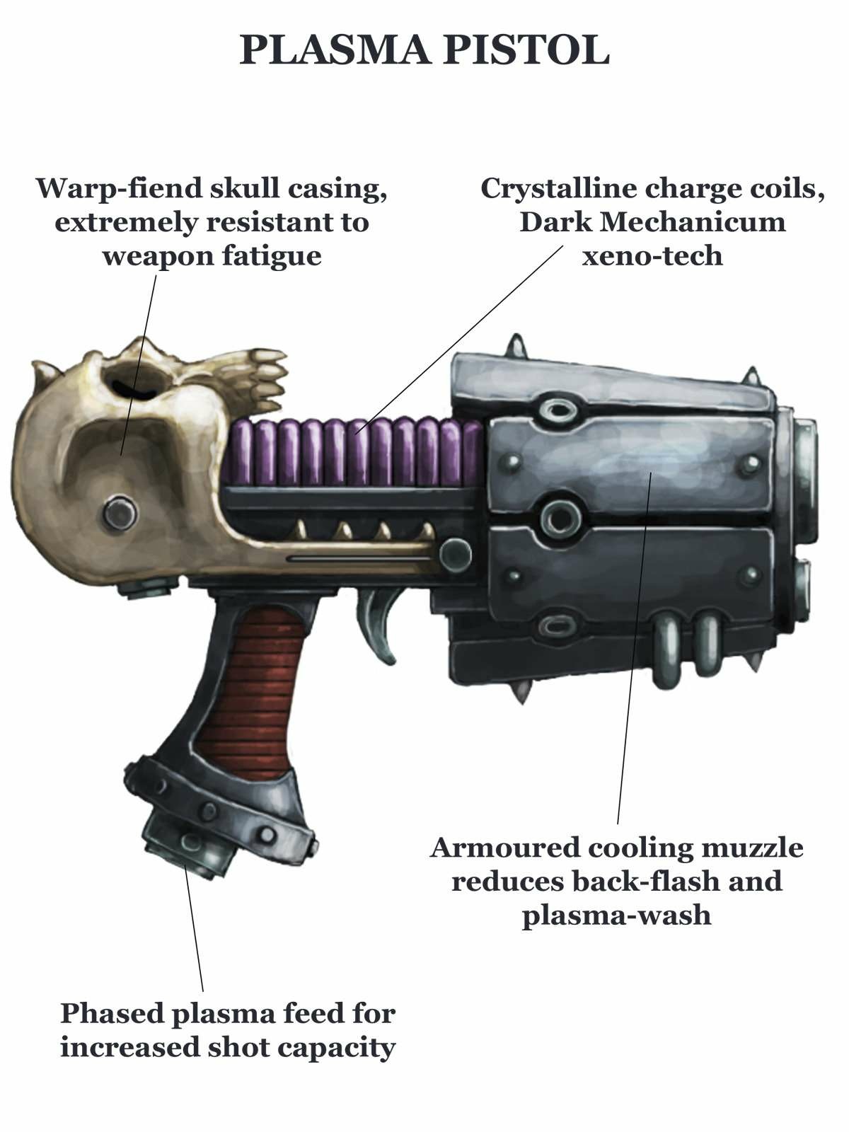 卡恩的远程武器,这把手枪由黑暗机械神教打造,枪身被混沌恶魔的颅骨包裹,结晶充能线圈能保证等离子能量的稳定输出,即便在持续射击后也不会出现过热故障。