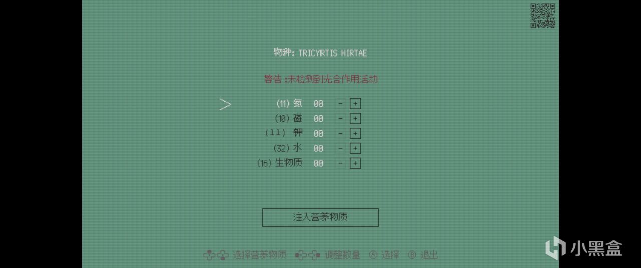 探索過程中能收集到氮磷鉀和水資源,擊敗敵人能收集到生物質。當遇到研究所特定的培育設施時,能按照特定的組合來完成培育。而這種謎題每次的花樣都不一樣,有的是很簡單的“管理員模式提示”,有的是掃描二維碼查看線索,最離譜的是有一次是真人視頻,拿着瓶子分別給桶裏倒和拿勺舀不同元素的配比。