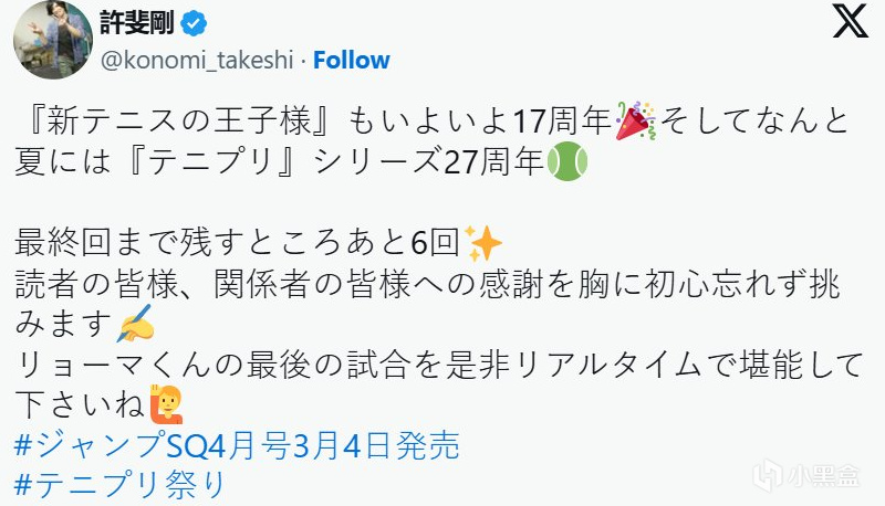 2月28日,作者许斐刚在X平台的个人媒体账号发文宣布,目前连载中的《新网球王子》距离完结仅剩6话,也恰好迎来作品连载17周年的里程碑,也回应了作者去年7月说的完结计划。