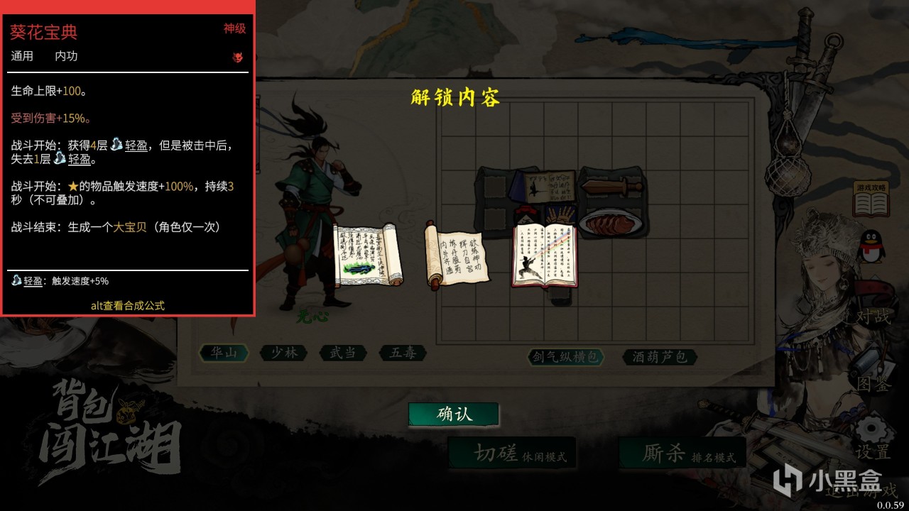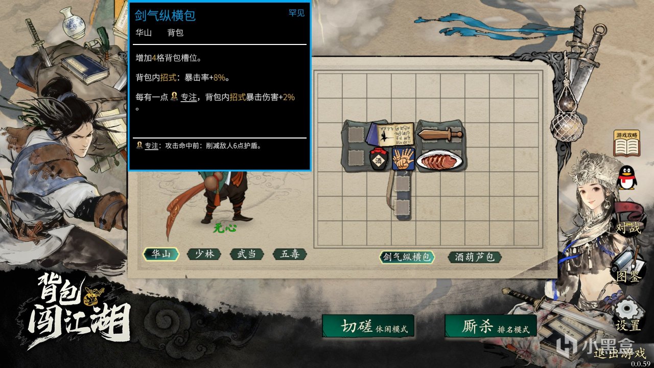 《背包闯江湖》还没正式发行,在本次新品节提供了免费DEMO供我们试玩。目前的DEMO提供了华山派、少林派、武当派和五毒教四个门派(看图鉴里后续应该还会有丐帮、逍遥派和血刀门),每个门派各有俩个不同的初始背包,不同的门派的初始武学装备等配备也会有所不同。