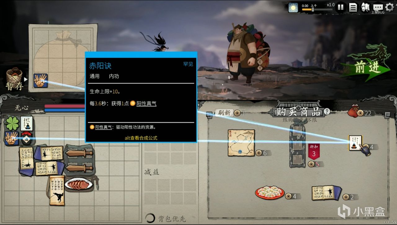 江湖路上的各种商店和奇遇也是我们获得提升的主要途径,在商店里我们可以用金币购买各种物品和武学,当然各种扩大背包容量且带有各种效果的“背包”也会在商店出售,这可是提升实力的最大凭仗,所谓背包越大,可能越大!这是绝对不能错过的!