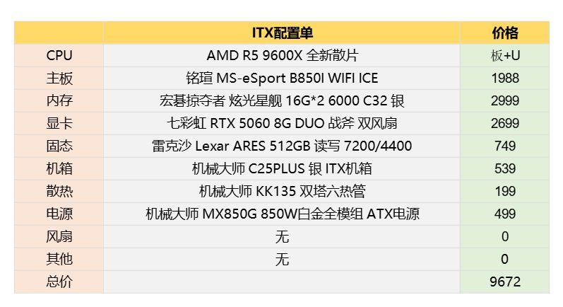 第二套搭配了ITX机箱C25PLUS,也相对适用学生党带去学校宿舍等环境,ITX机箱可以节省更多的桌面空间和方便运输,同样选择到了极具质感的黑银配色;硬件搭配上选择了9600X+5060,可以满足日常的游戏和生产力需求,游戏性能绰绰有余