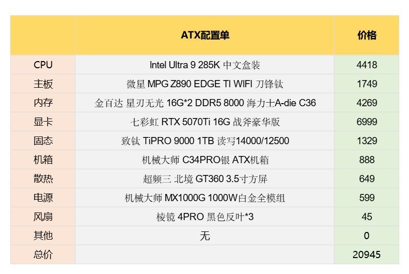 显卡的选择为5070Ti,50系显卡里面相对有性价比的选择,游戏性能在4K的表现上更具优势;图上暂时用一张七彩虹4070展示,显卡方面有多少预算就用预算的50%左右进行搭配选择即可