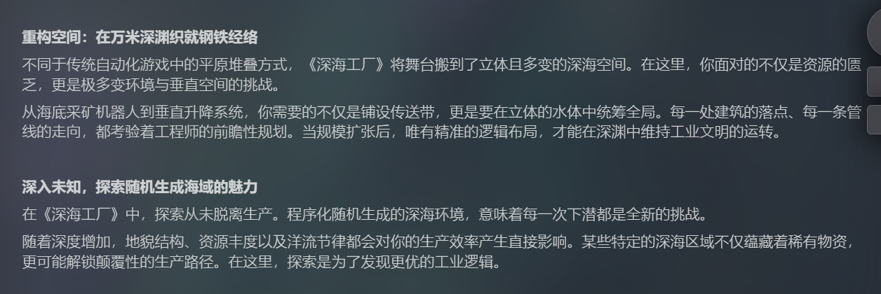 現在熱度比較高的幾款新自動化遊戲,其實門檻都不算高,比如深海工廠,基本不用特意去研究什麼技巧,跟着遊戲裏的引導走,就能慢慢拿到需要的資源,玩法也會一步步熟悉起來。