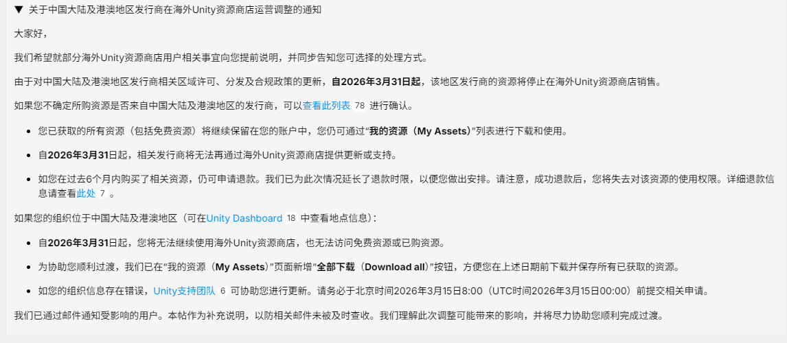Unity官方宣布,由于对区域许可、分发及合规政策的更新,自3月31日起,停止中国大陆及港澳地区发行商在海外Unity资源商店的销售、更新及支持服务。