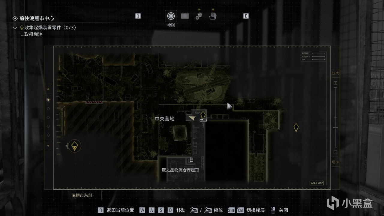 12、物流仓库屋顶,在屋顶拾取关键道具后,自动使用望远镜侦察区域,然后转身面向电梯,往高速公路上看,一辆报废汽车顶部。