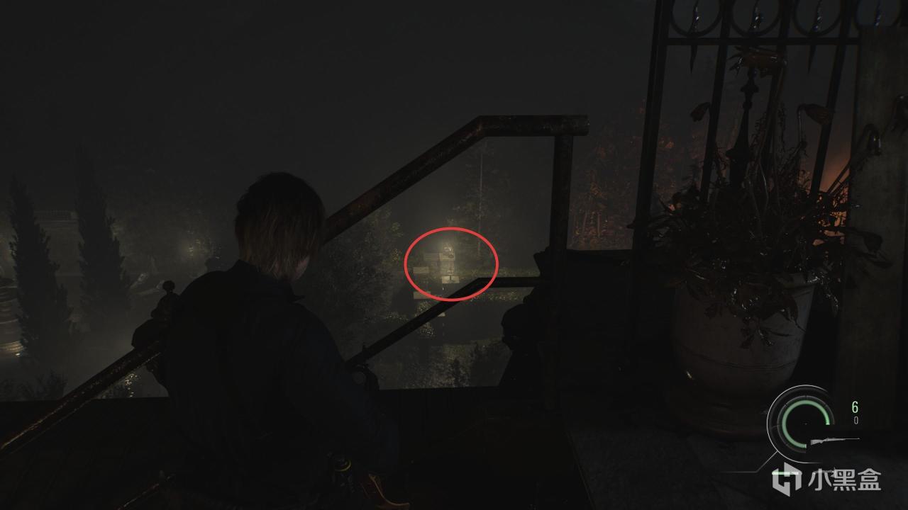 10、切换成里昂时,翻过面前的窗户直走,到达尽头后跳下,再上到楼梯顶端,不要进门,左手边庭院里的灯座边。。