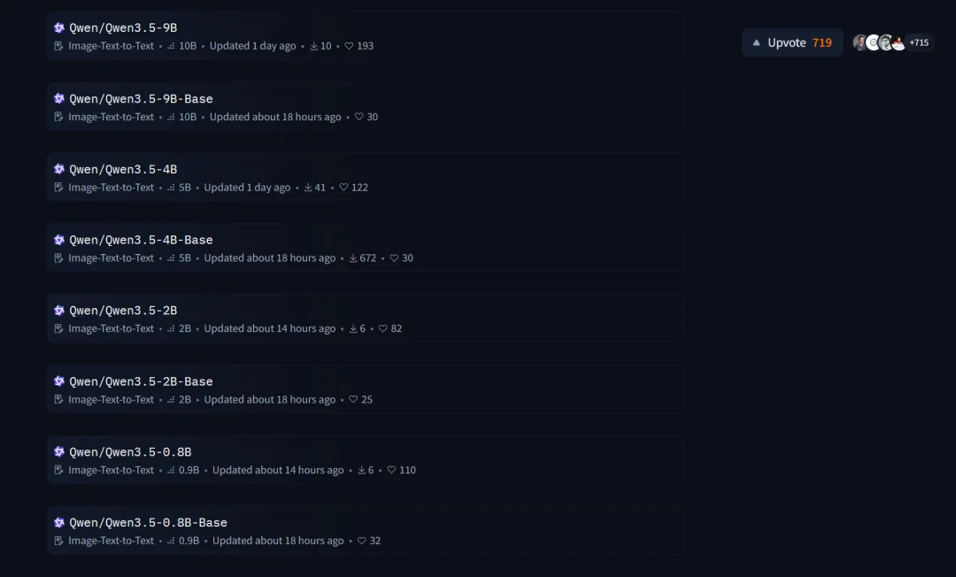 他们直接把 Qwen 3.5 系列的小模型全线开源:0.8B、2B、4B、9B四个尺寸一次性推出,指令版和基础版都有,协议也是较为宽松的 Apache 2.0 开源协议,谁都能下载、商用、修改(但是该协议有明确的专利保护)。