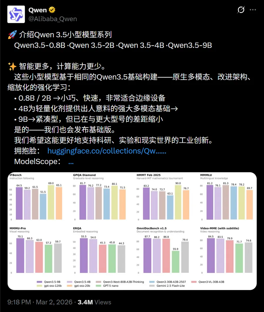还没来得及细细体验春节期间开源的 Qwen 3.5 大模型时,Qwen 团队又在昨天一口气开源了多款小模型,再次刷新了节奏与产出效率。