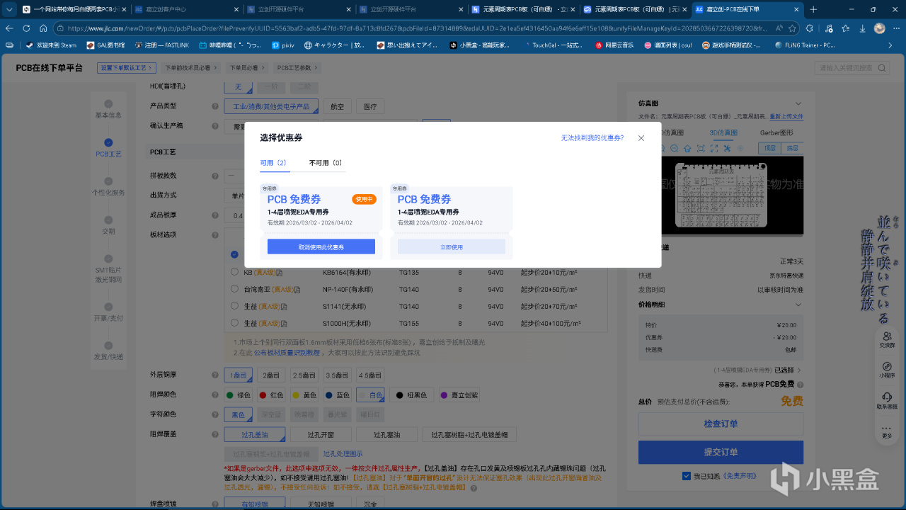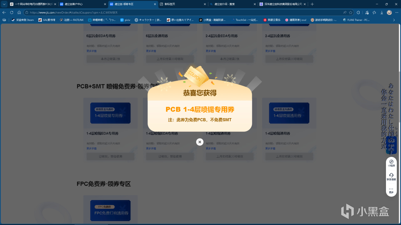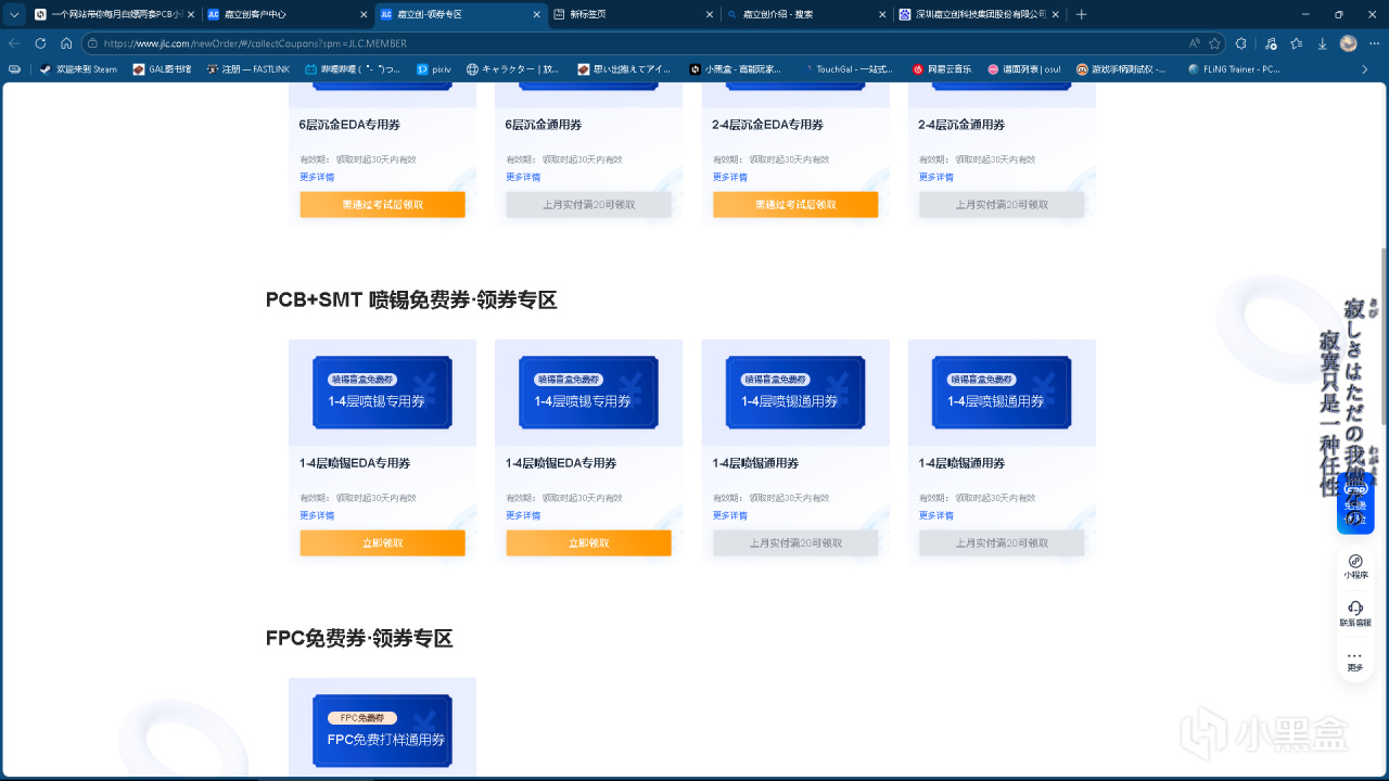 登录后每个账号每月可以在优惠卷中心——PCB免费卷处领取两张PCB免费打样卷