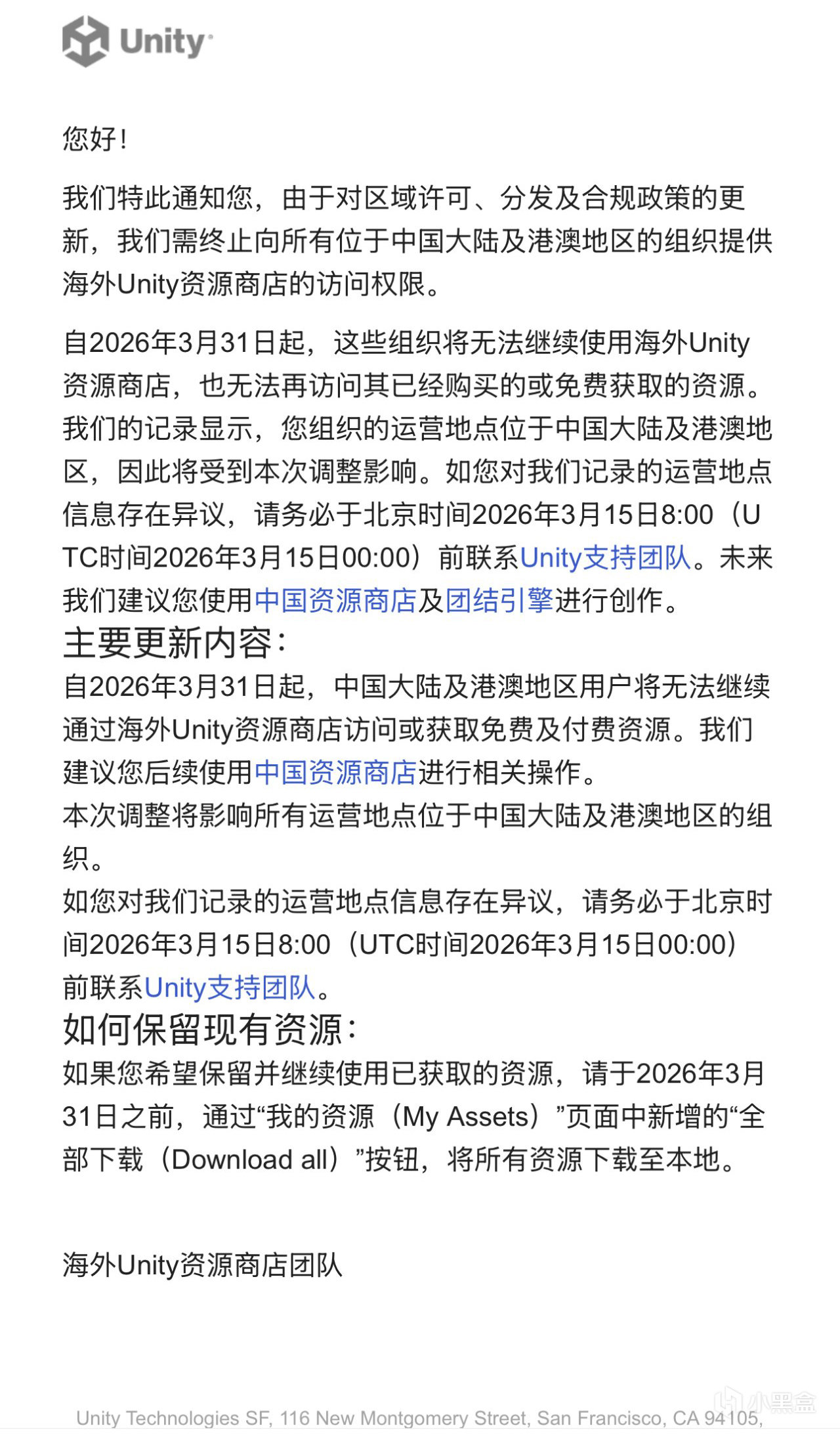 好吧,想必很多開發者都已經收到了Unity的郵件了吧,大概意思就是2026年3月31日起,咱們國內的Unity將無法使用海外的Unity商店資源了,以後只能用到中國資源商店也就是團結引擎中的資源了。如果想保留資源,就需要吧以前的資源全部下載到本地。好吧好吧,看樣子Unity是真的想失去國內市場啊!