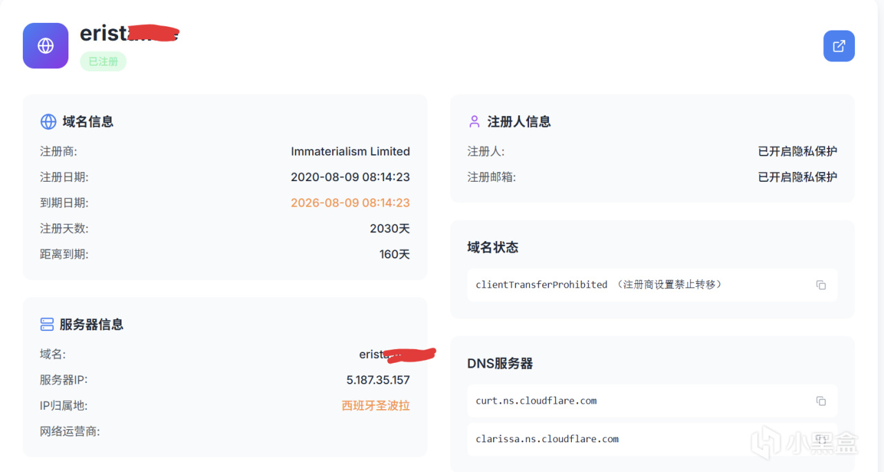 项目域名注册于2020年8月9日,有效期至2026年,目前距离到期仅剩160天。WHOIS信息显示隐私保护已开启,注册人与邮箱信息均不可见。