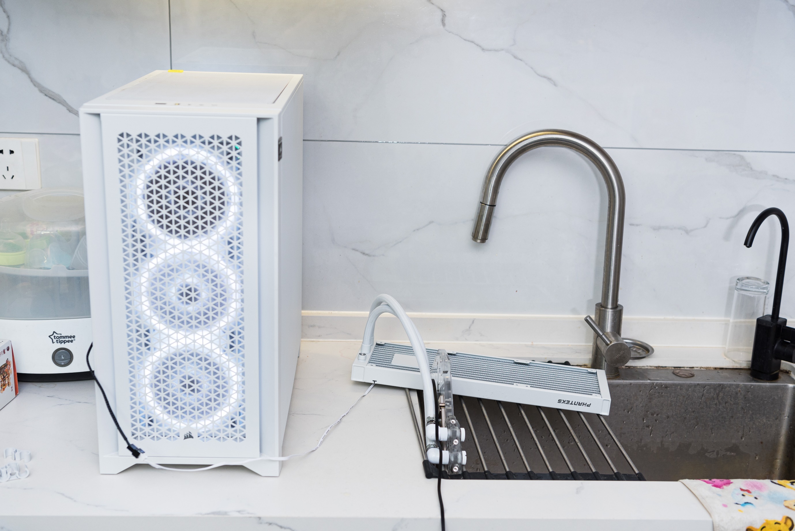 摇了一下冷排有水声,里面还有不少气泡,从注水口排不掉,搬二奶机过来上电运行测试了一下。