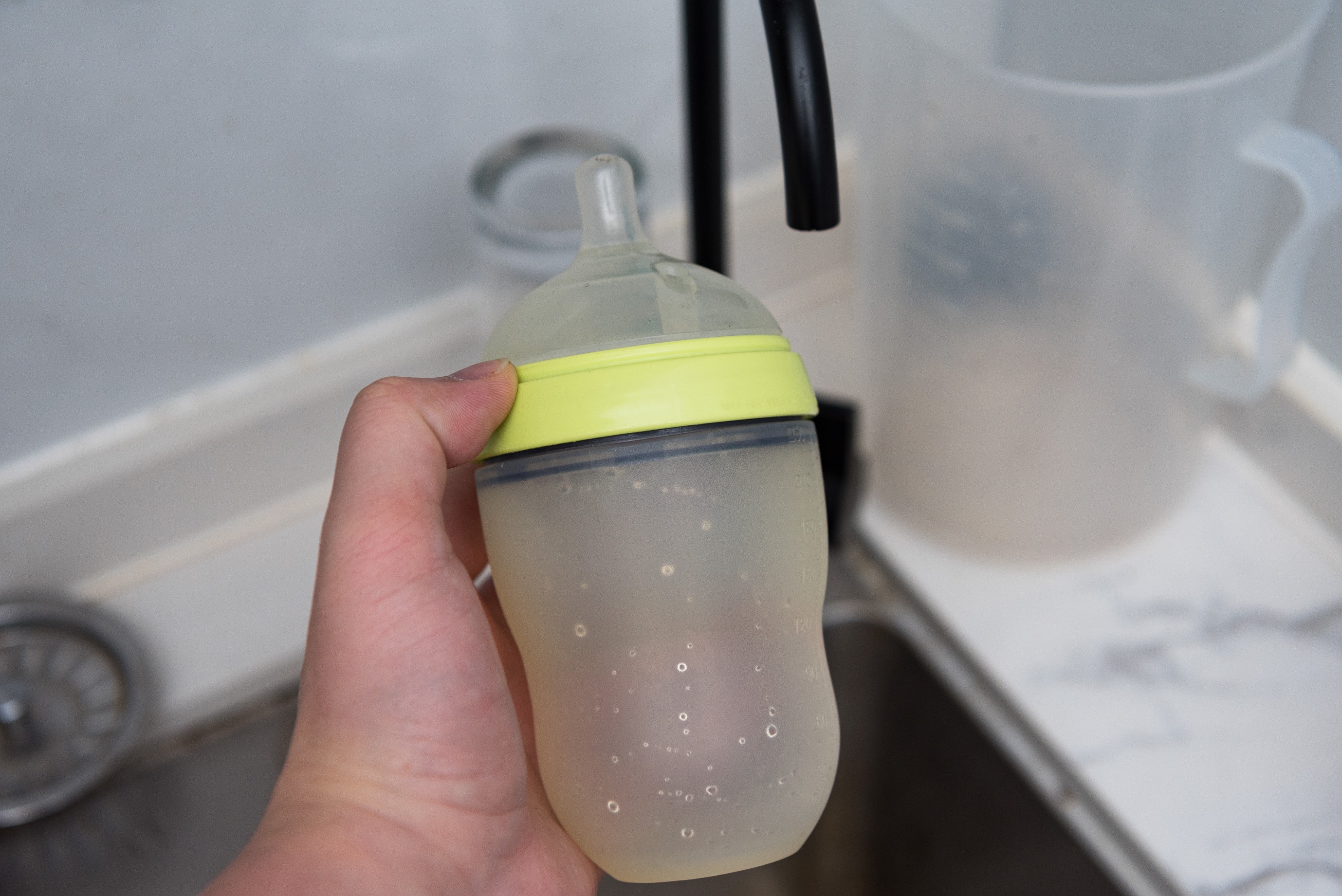 找了个灌液神器,家里宝宝的旧可么多么的硅胶奶瓶很好用,奶嘴按在接口上直接挤,分分钟搞定了,整个水系统目测有300ml左右的水量。