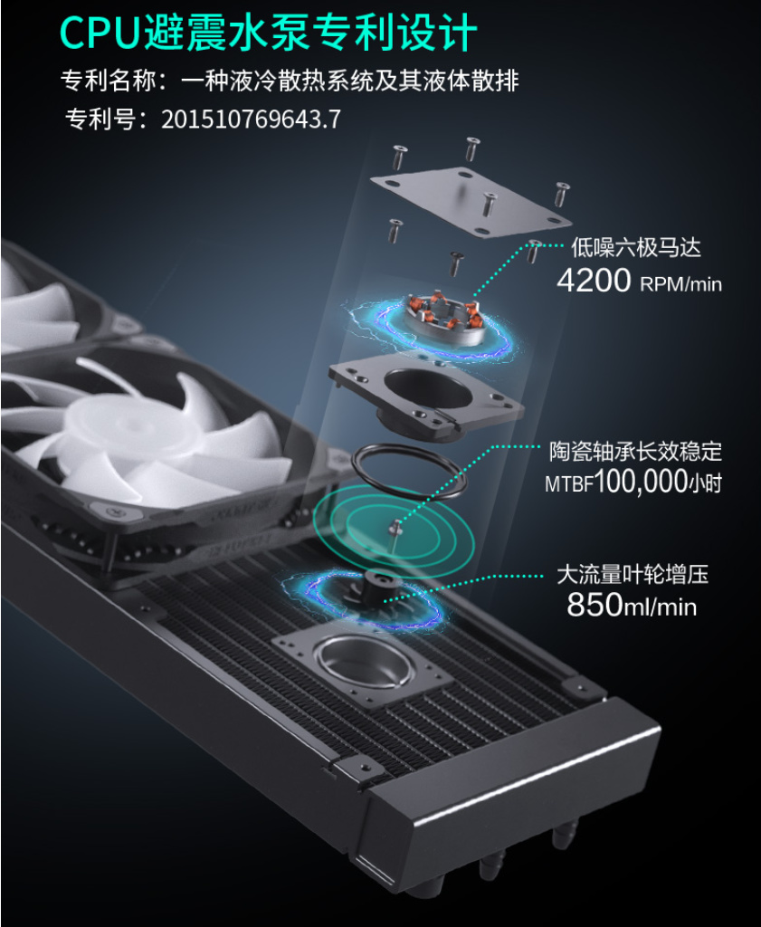 为什么说是宝藏,因为发现它有个专利技术,把水泵设计在了冷排上,而这不就是泵排一体吗?水泵还比较给力,一体化程度很高,纯白的颜值完美!