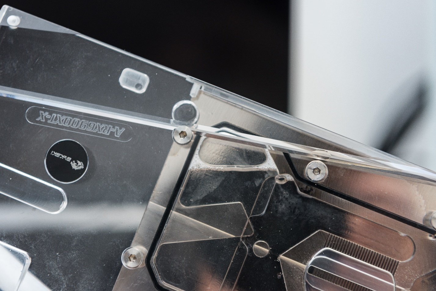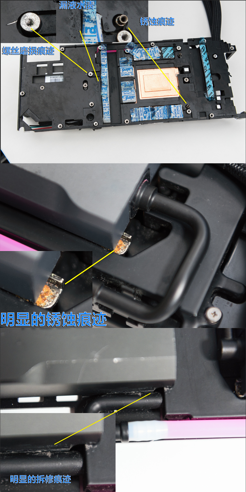 满满的战损状态,刚到手拍的照片细看全是问题,严重的螺丝磨损痕迹,外壳有液滴,不少螺丝部位甚至生锈了……这就是个拆修组装了不知道多少次的冷头,目测上届主人的卡是被他干掉的,难怪会有糊味,我是不敢做它的新主人了,这比矿卡还矿。。。