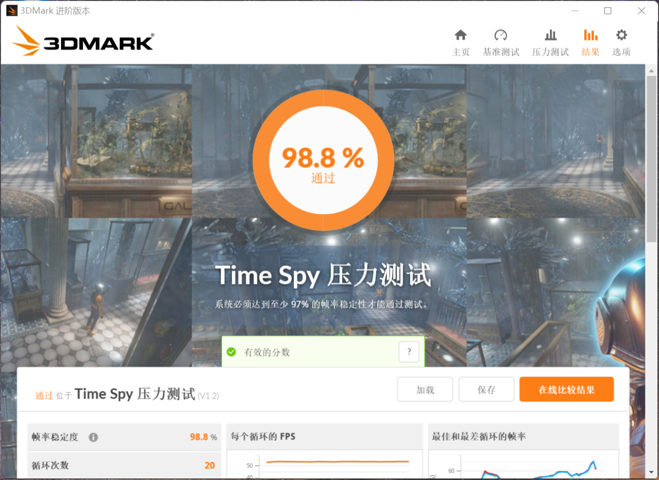 这块卡入手检测还不错,压力测试98.8%,超过了97%,20个循环2次降频,显卡没什么大问题。