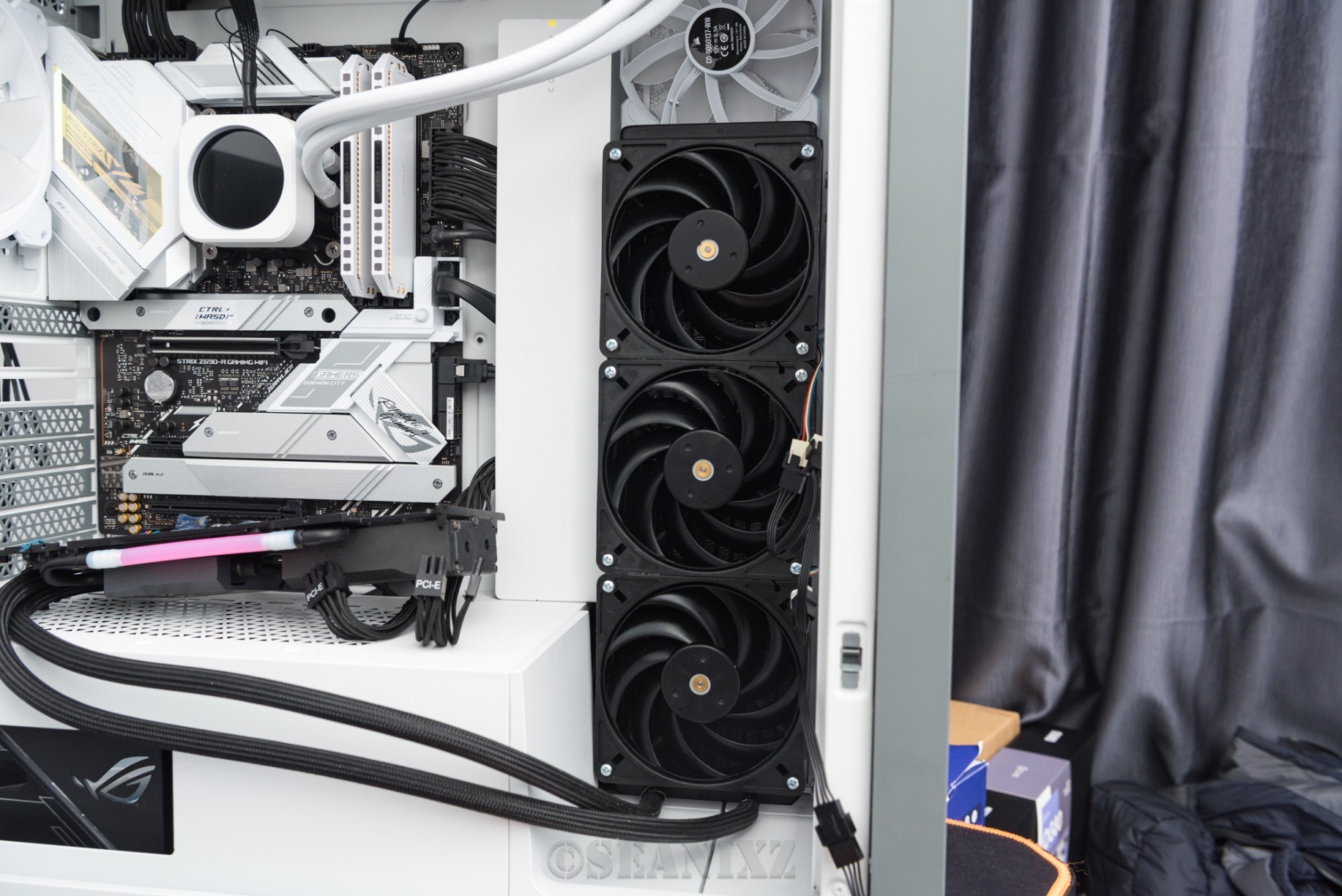 上机照,除了颜色不搭外其他还好,全塔机箱任意位置都可以顺利安装,支持性也不错,可以利用机箱前面板风扇散热,。