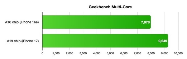 根据性能测试对比,A19的单核得分约为3627,多核得分约为9249,相比A18(单核3242,多核7976)分别提升了约12%和16%。在图形性能(Metal)测试中,得益于GPU架构的改进,A19的得分(37146)远超A18(23888),提升幅度接近一倍。这意味着iPhone 17e在处理图形密集型任务和游戏时将拥有更出色的表现。