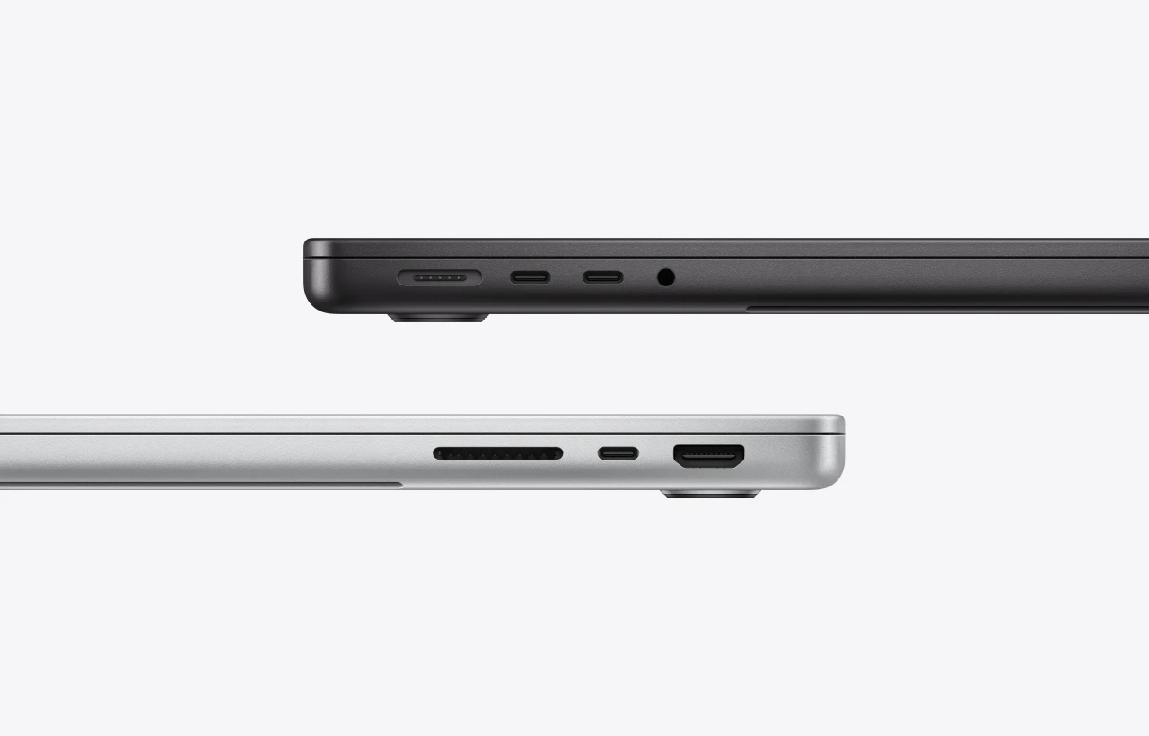两款新品均配备 SDXC 卡插槽、HDMI 端口、3.5mm 耳机插孔、MagSafe 3 端口以及三个雷雳 5(USB-C)接口,均支持充电、DP、雷雳 5 以及 USB4。