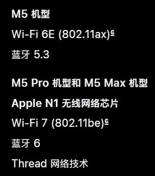 本次 M5 Pro 以及 M5 Max 机型还新增了 Apple N1 无线网络芯片,支持 Wi-Fi 7(802.11be)、蓝牙 6 以及 Thread 网络技术。