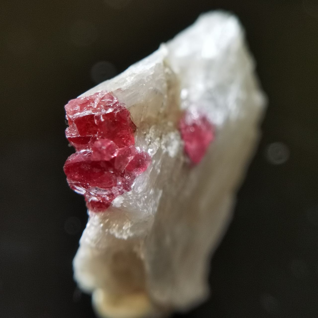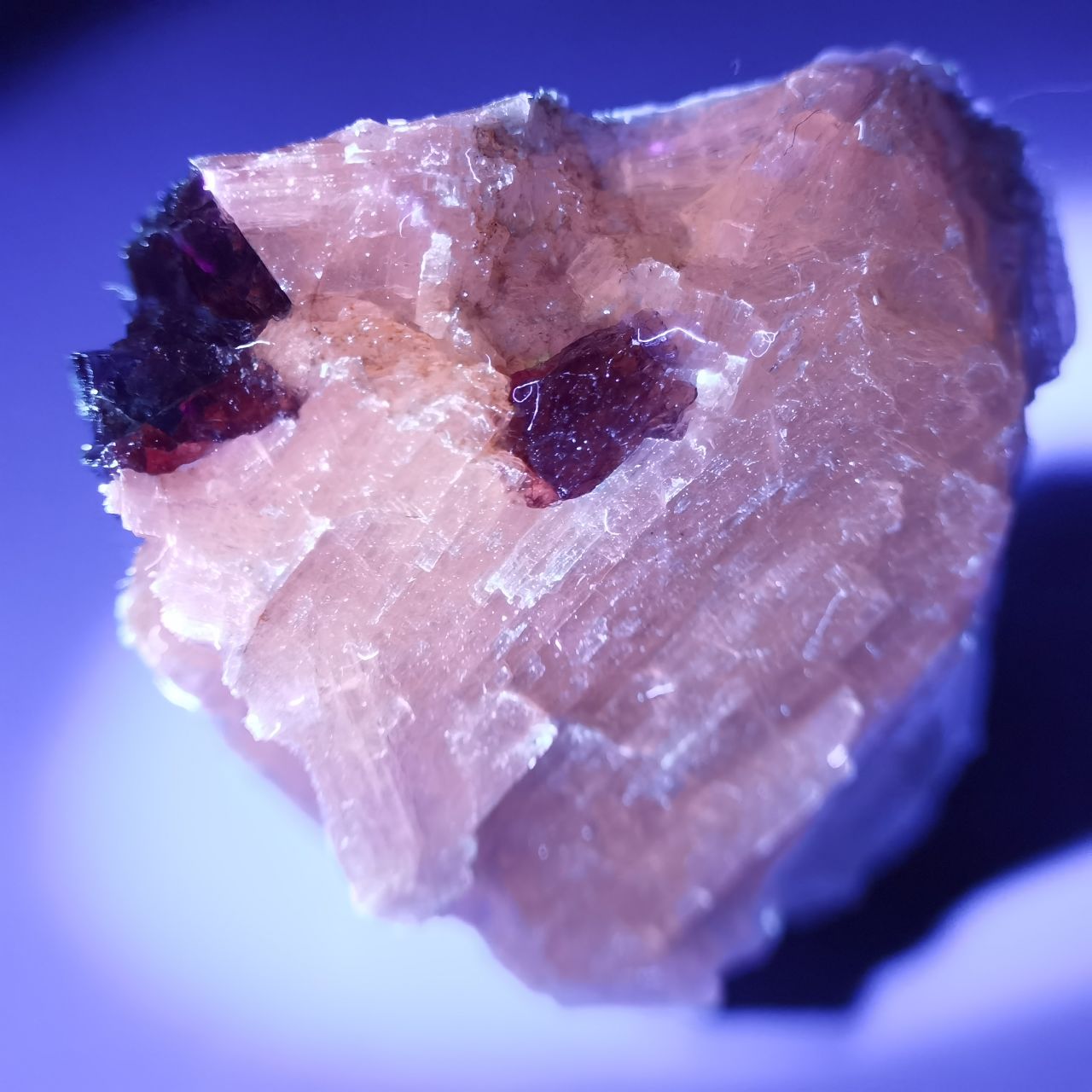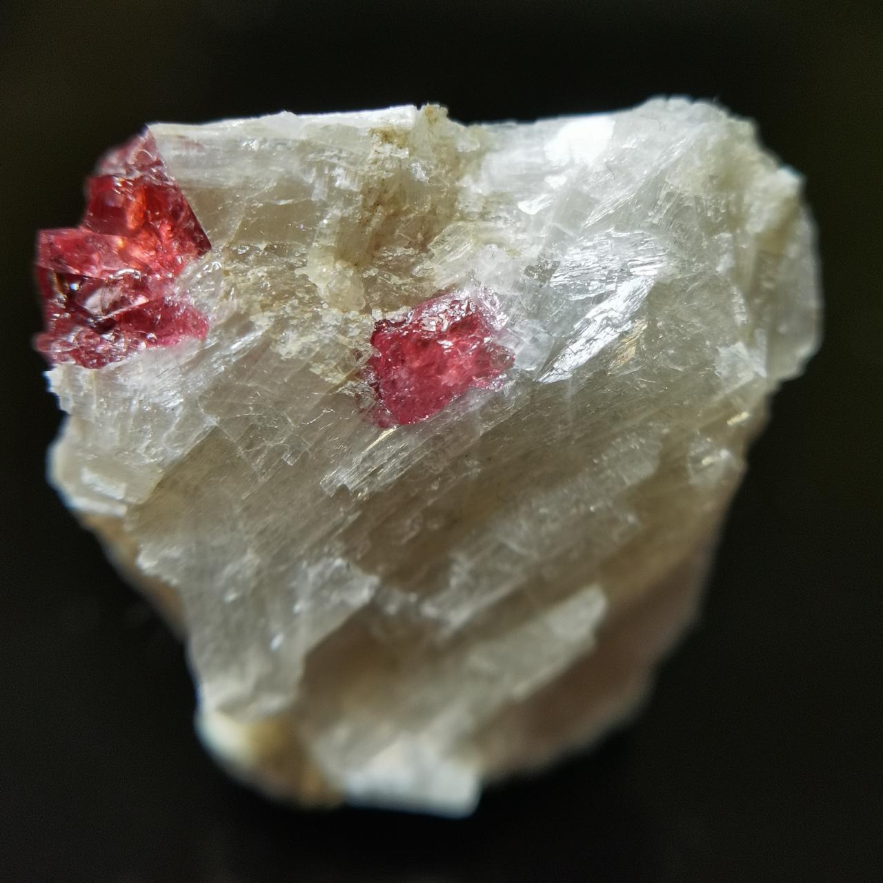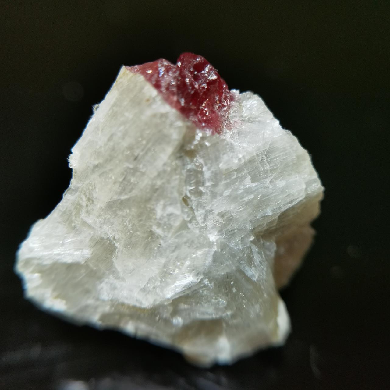 本块标本的异性石并无明显晶型,点缀在白色纤维状的氟硅钙钠石上很有产地特色,也形成良好的对比,微距下异性石似乎有一点点自型?总的来说是不错的产地标本