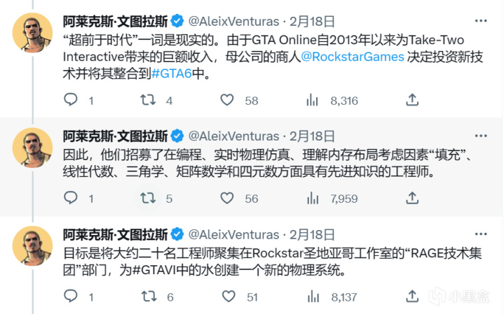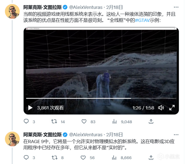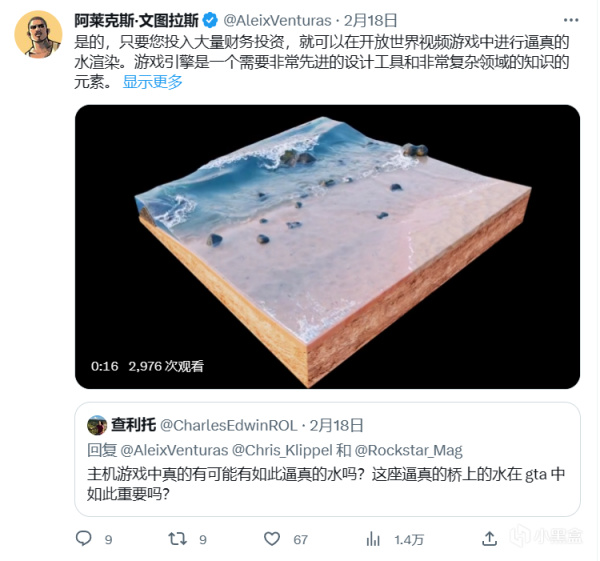 专为R星游戏创作的自由撰稿人Aleix Venturas日前发推文表示:在《GTA6》中,R星将使用一种类似于英伟达Waveworks的高级水体渲染技术,NVIDIA已经尝试了WaveWorks 1.0和2.0的实验,但真实/性能比从未被利用过。该技术非常先进而且需要大量投资,以至于绝大多数游戏都无力使用。根据这一点,Venturas推测《GTA6》中会有一些水上活动来展示这项技术,例如冲浪等等。