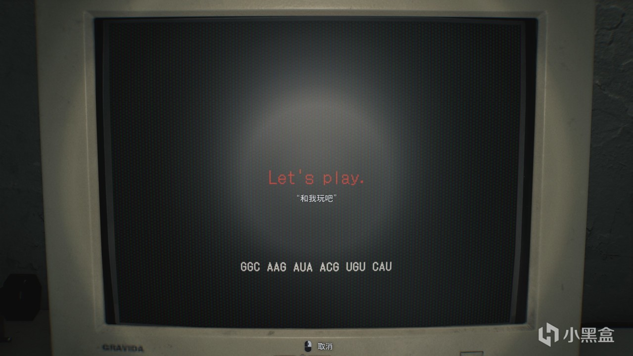 8、来到东楼一楼血液研究室,分析断手(先点中间,然后点两端),看到显示“Let's play“和“GGC AAG AUA ACG UGU CAU“的两端话。