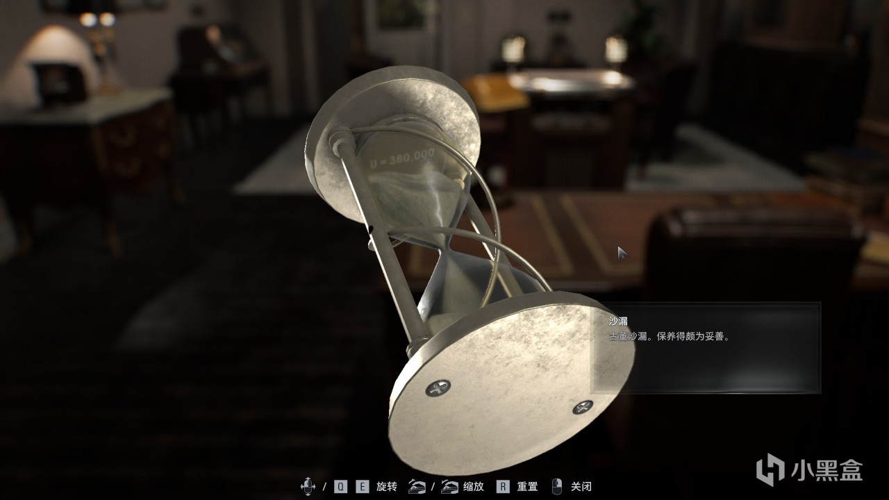通过查看贵宾室拾取到的”沙漏“,将沙漏旋转倒置等沙子流到另一边,可以看到底座上记录着“U=380,000“,根据地球与月球距离约38万公里的信息,可知出“U“代表“月亮“