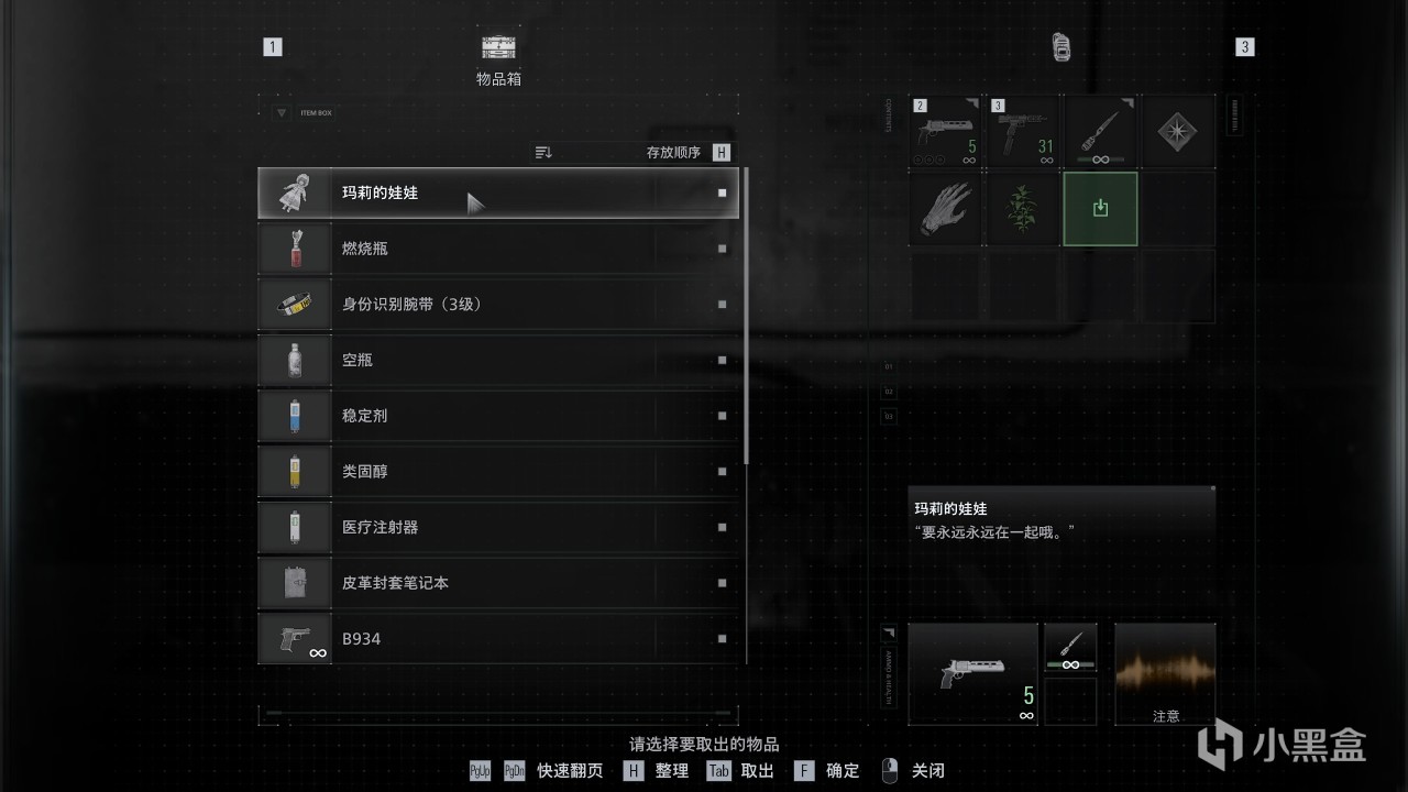 7、然后读取警卫室的存档,从储存箱里取出“断手”和“玛莉的娃娃”。