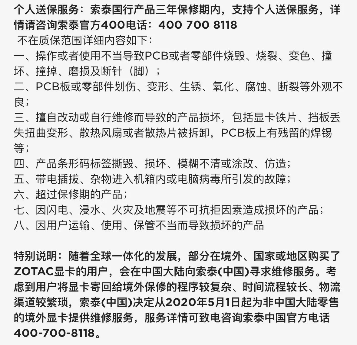 标准的3包政策,售后服务还不错,还有一个特点就是国外买的显卡能在国内保修。但50系不太推荐索泰,高端不像高端还别自家以下犯上,低端还比以前差不少。