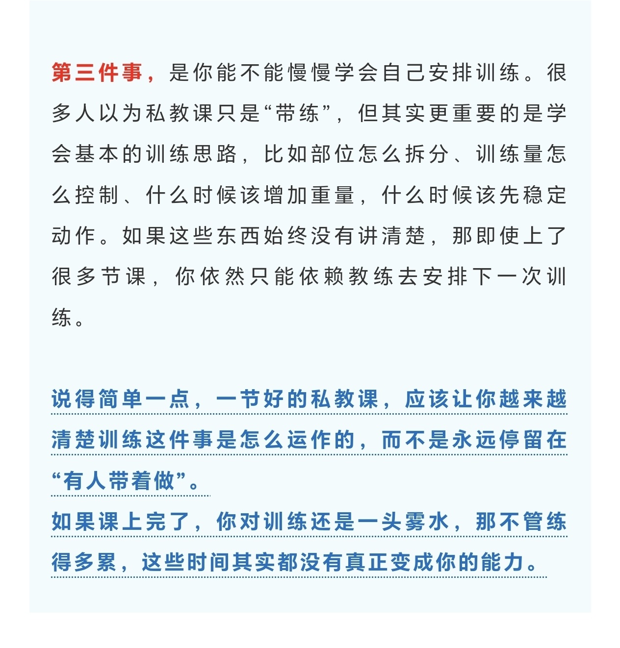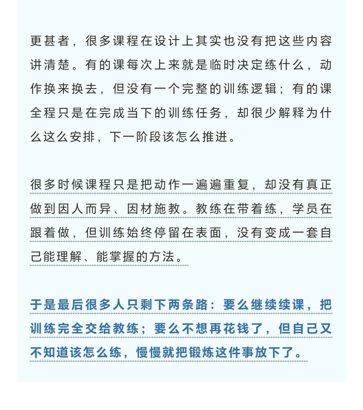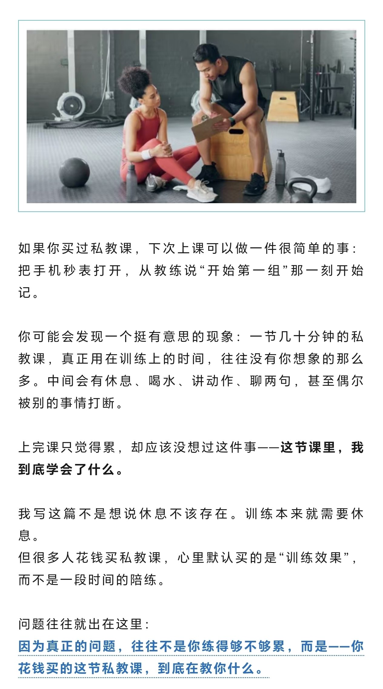 很多人花大价钱买私教课,课上完就回到原点,依然不会独立训练、不会安排计划。真正有效的学习,是掌握方法,而不是只跟着练完一节课。