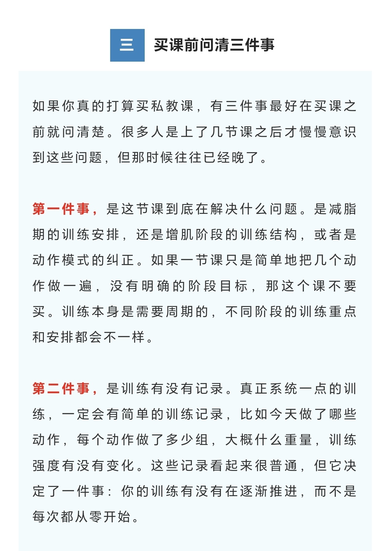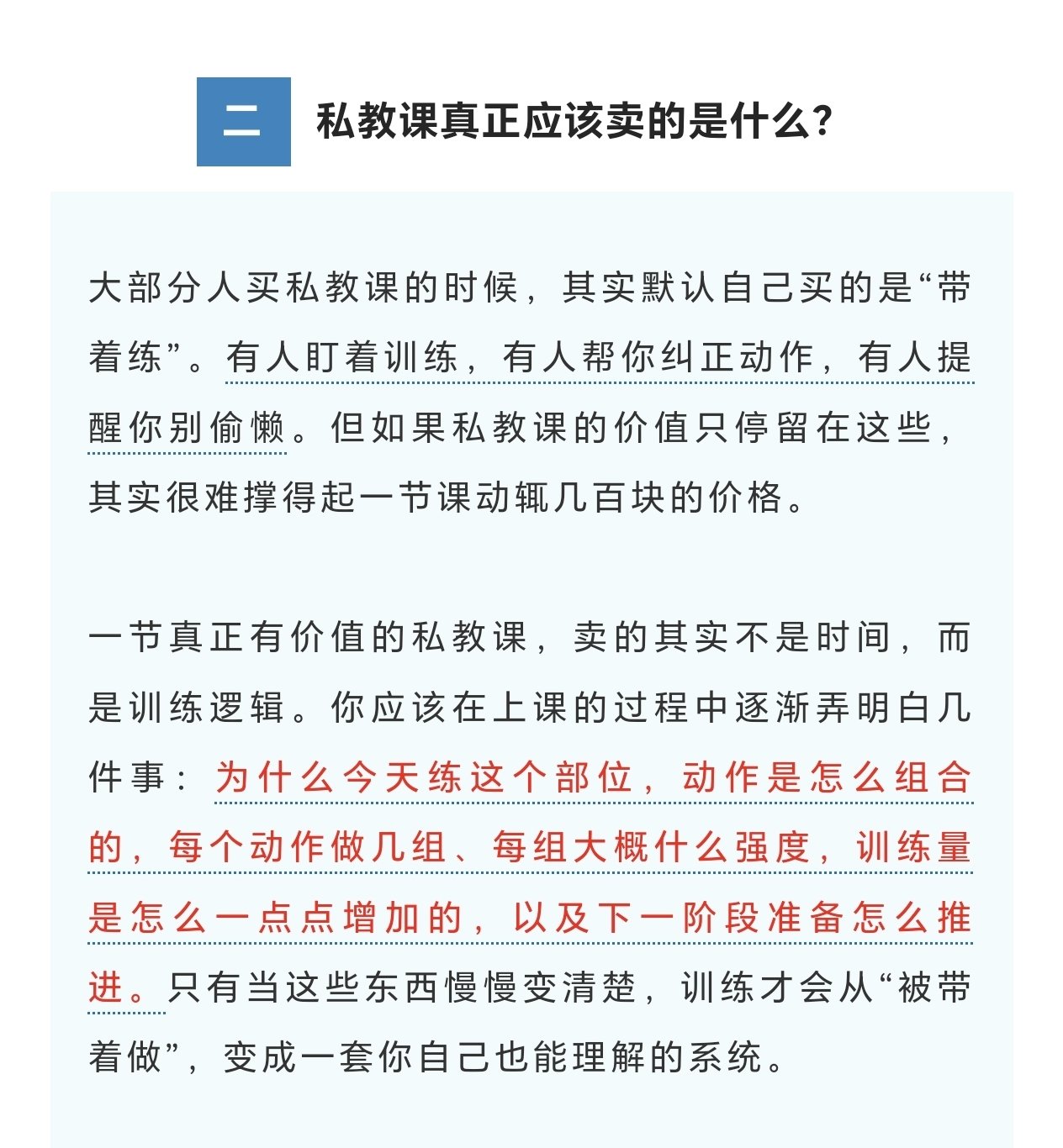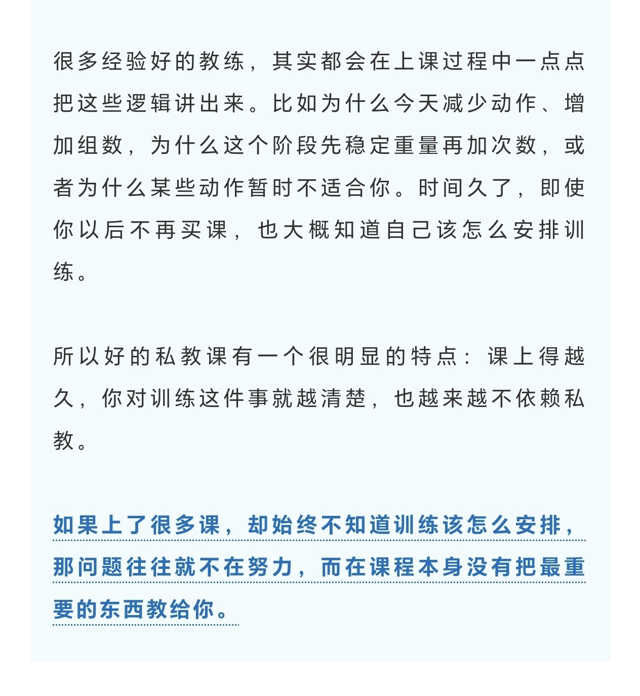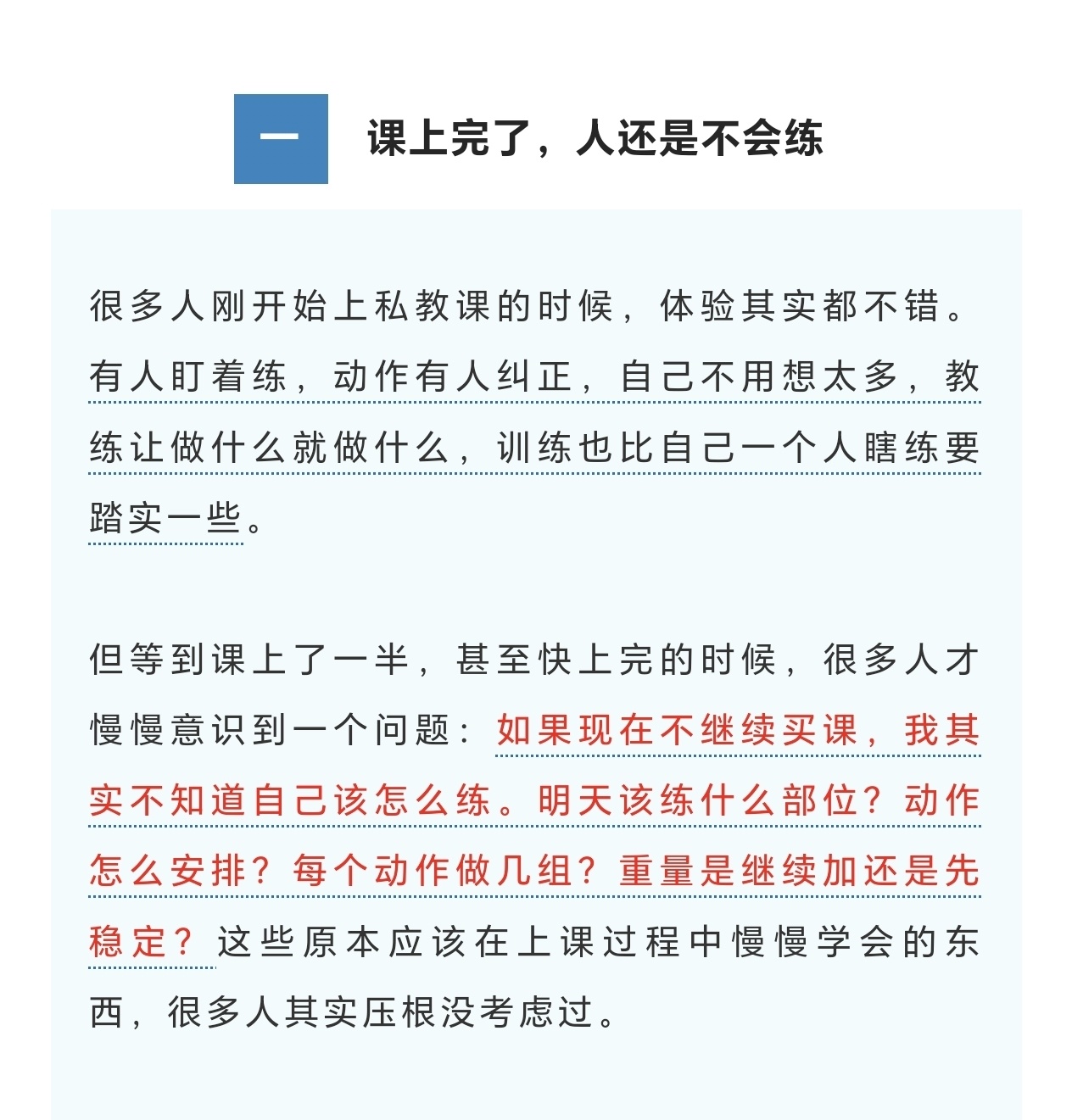 很多人花大价钱买私教课,课上完就回到原点,依然不会独立训练、不会安排计划。真正有效的学习,是掌握方法,而不是只跟着练完一节课。