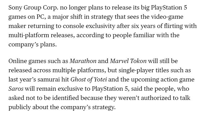 需要說明的是,像《失落星船:馬拉松》和《漫威鬥魂》這樣的線上遊戲仍將在多個平臺上發佈,但單機獨佔遊戲——例如去年發售的《羊蹄山之魂》以及即將推出的《沙羅週期》,將保持主機獨佔。