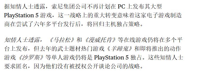 今日,據彭博社報道,知情人士透露,除了《失落星船:馬拉松》和《漫威鬥魂》等在線遊戲仍將登陸多平臺外,《羊蹄山之魂》和《沙羅週期》等第一方單人遊戲將不再登陸PC。