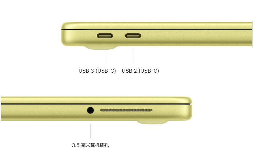 未配备 MagSafe 磁吸充电接口,仅提供双 USB-C,和3.5mm耳机接口。